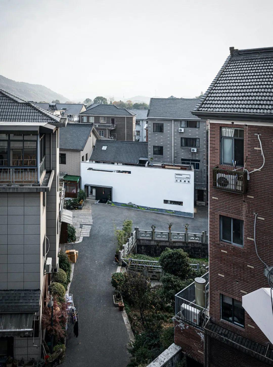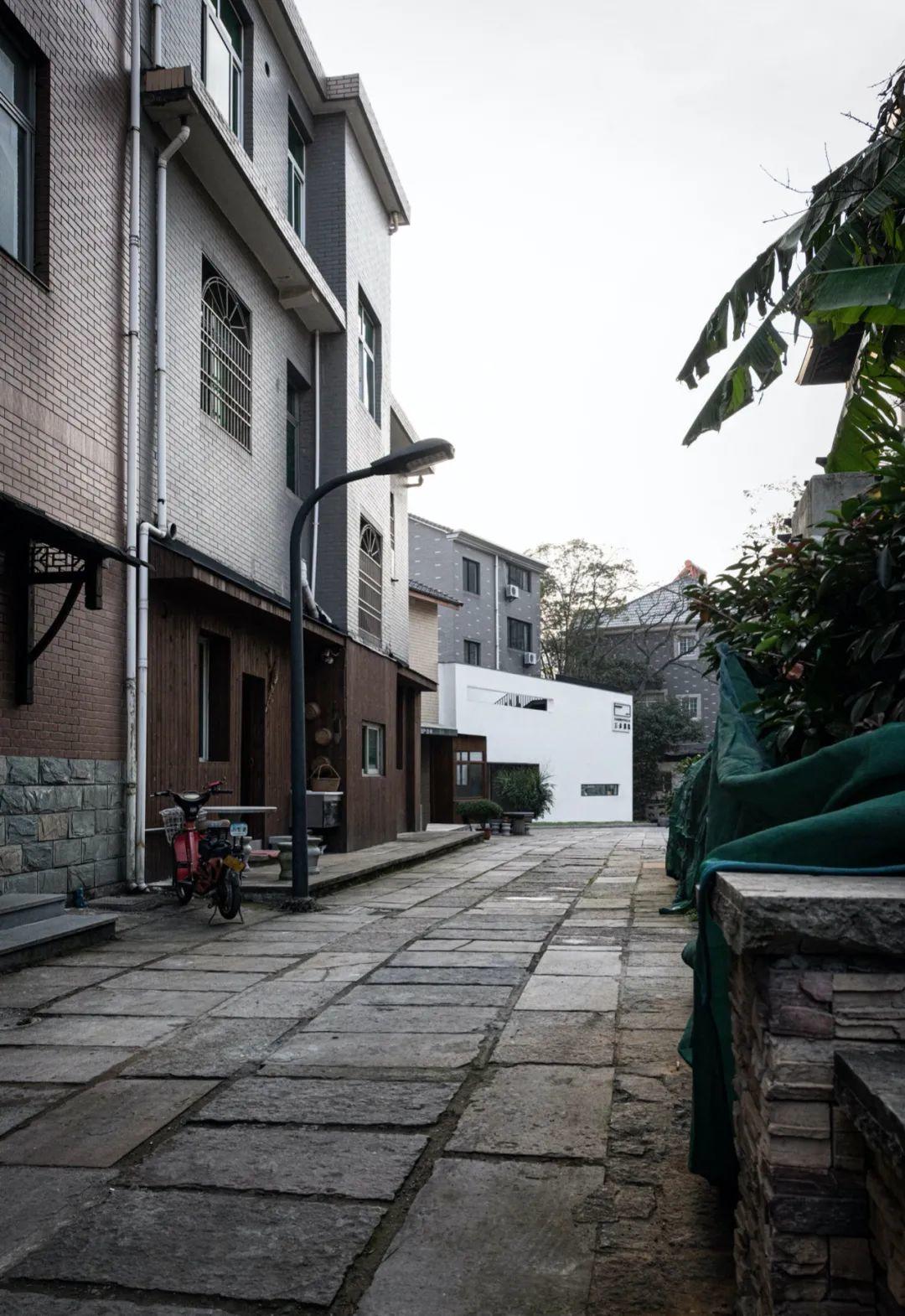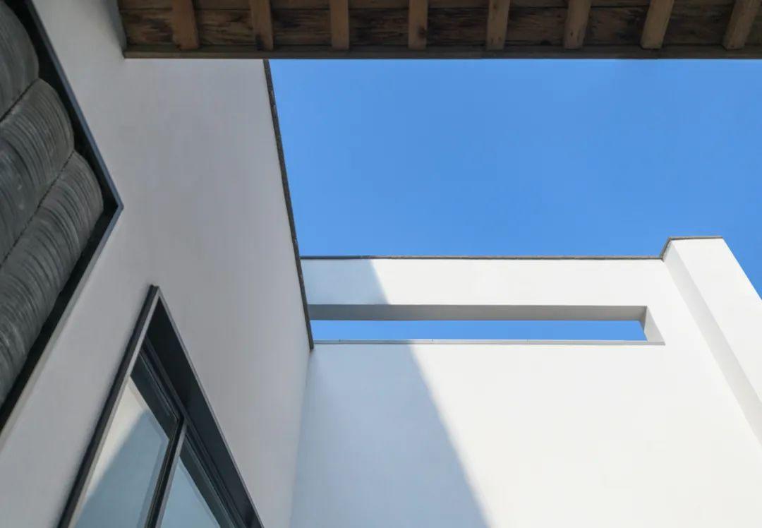 作為聚落內僅存的老屋,設計師以一道大型白色牆面為中介設置於社區中央,以留白、簡約的形式橫亙在新舊建築之間,企圖統一兩者完全迥異的空間場域氛圍。隱身在白牆之後的老屋基地,一方面保留既有結構系統、牆面裝飾與構築型態,同時也植入部分新材料、新工法,藉此保留既有建築形制並傳承古屋風韻。