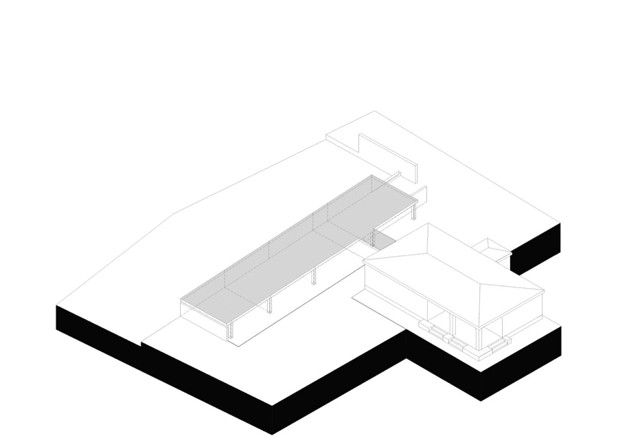 建築師首先要做的是建造一個新的建築,在新建築、舊建築和游泳池之間建立一個三角區域,用來限制外部空間的大小,目的是將生活空間從私密空間中抽離,並建立起與氣候、向朝、視野角度,地形以及植栽等條件之間的聯繫。