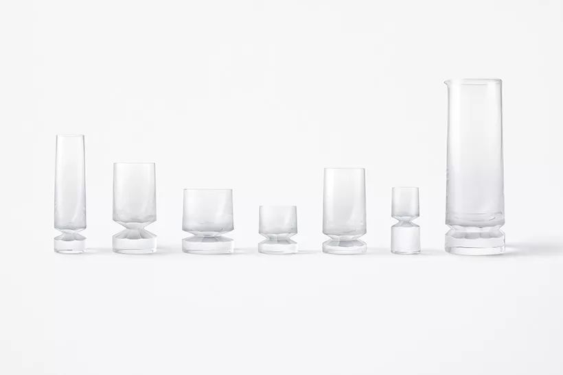 六件套玻璃器皿系列,包括酒杯、威士忌酒杯、玻璃瓶、長笛杯和鉛彈杯,專為捷克水晶玻璃製造商Lasvit設計。