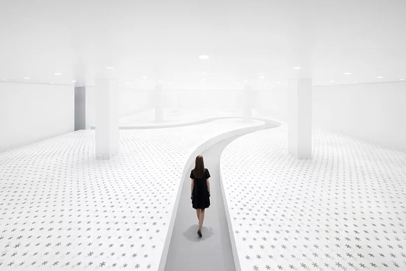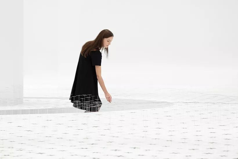 為了利用這一原理創造空間體驗,天花板上懸掛了115盞帶有獨立控制電機的偏振光聚光燈。在地板上,17,000個花狀偏振薄膜以計算好的圖案展開。每朵花被放置在不同的高度,所以整個空間看起來像一個平滑的波狀景觀,就像一個真正的花園。