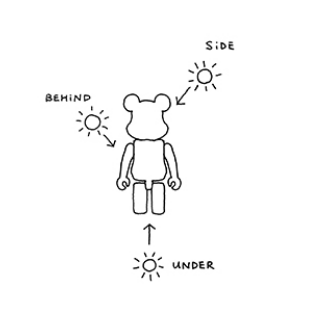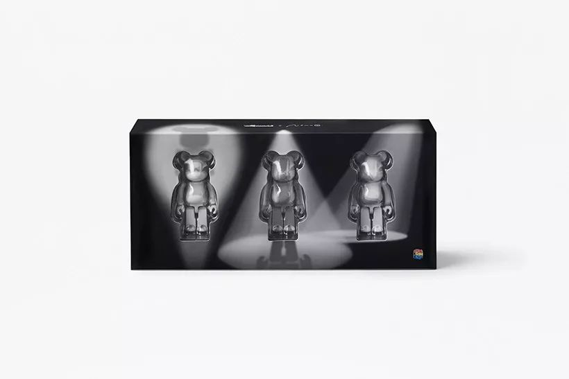 包裝是由簡單的黑色製成,只有聚光燈的軌跡。代表合作的標誌,並沒有像慣例那樣放在「背面」,而是印在「腳掌」上,當BE@RBRICK坐下時就可以看見。