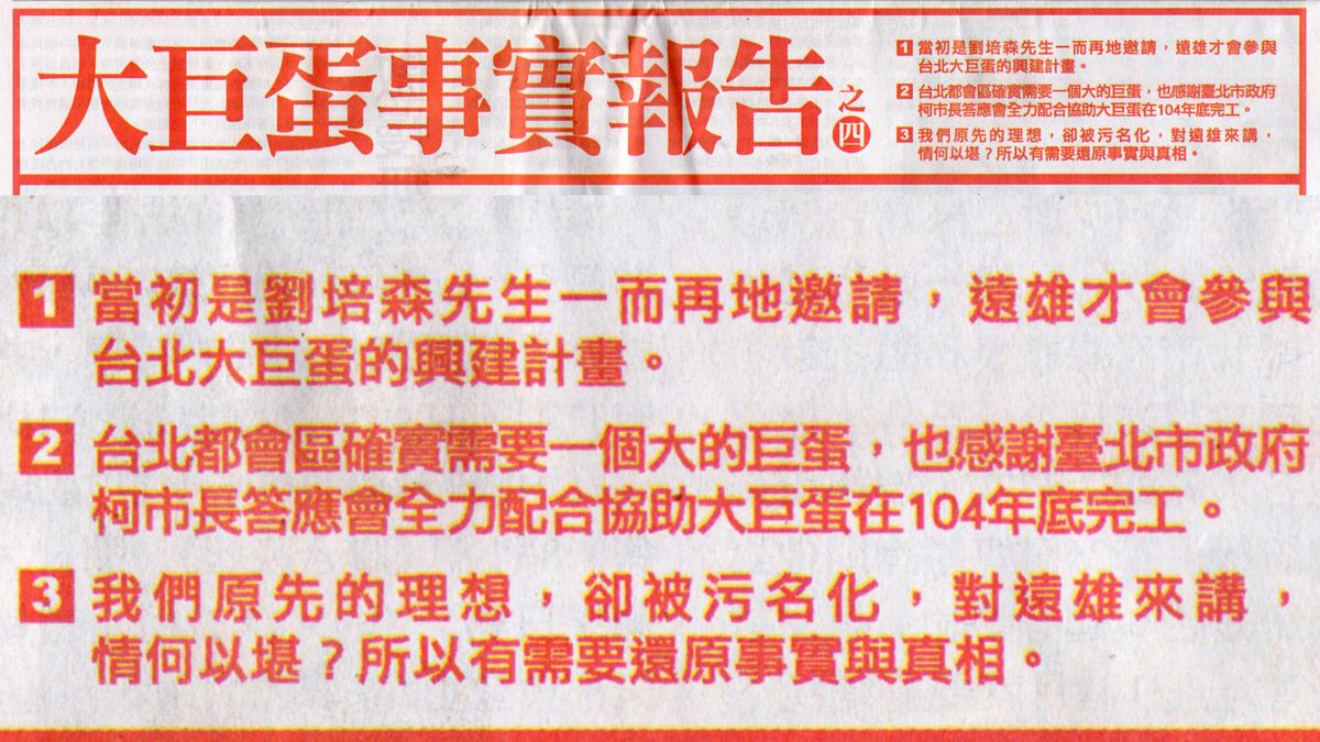 遠雄以「大巨蛋事實報告之四」為題,登出半版廣告,遠雄指出,過去針對與建築師劉培森拆夥、監委黃煌雄都曾分別刊登廣告,此次則是第四次。