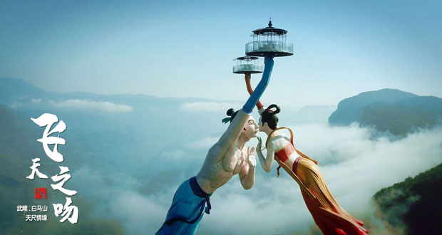 飛天之吻是天尺情緣景區的核心大型娛樂體驗設施,是全球唯一的雙子互動式飛行島,南邊的飛行島代表白馬王子,北邊的飛行島代表仙女,高55米,建立在一千多米高的懸崖邊上,登上飛天之吻,兩台飛行島慢慢旋升到千米高空,從空中可以俯瞰整個白馬山的絕美風景。在旋轉上升過程當中,兩個飛行島下方將徐徐展現出仙女與王子的雕塑——從地面上升到空中,在空中完成相遇,感受世界上最高最深情最浪漫的天上之吻。