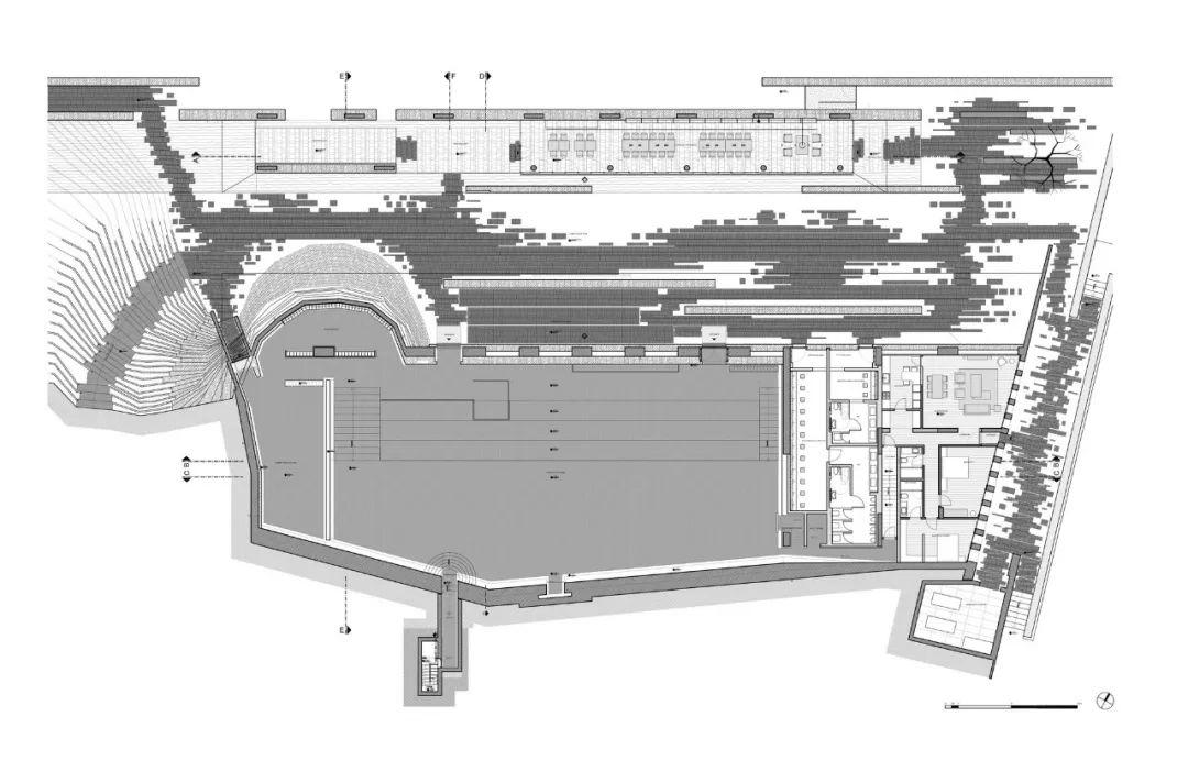 該作品不斷地在人為與自然之間製造緊張關係。沿著自然景觀斜坡的天然石質樓梯與跨越6公尺的薄鋼筋混凝土板之間的對比形成了天篷,這有助於增強這種雙重關係。