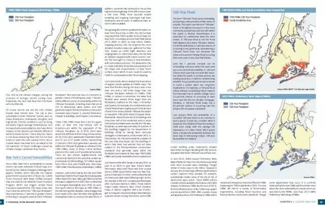 紐約市最致命的弱點,是在颶風桑迪中引起人們高度關注的沿海洪災。目前,約有40萬紐約居民和7.15萬幢建築以及大部分城市的重要基礎設施都位於100年一遇的洪水區域內 ——也就是說,在任何一年,在這個區域,洪水都有1%的概率。紐約市的海平面幾乎以全球平均速率的兩倍持續上升,同時NPCC預計,在未來幾十年,海平面將繼續上升,這意味著更多的居民、建築物和基礎設施面臨風險。