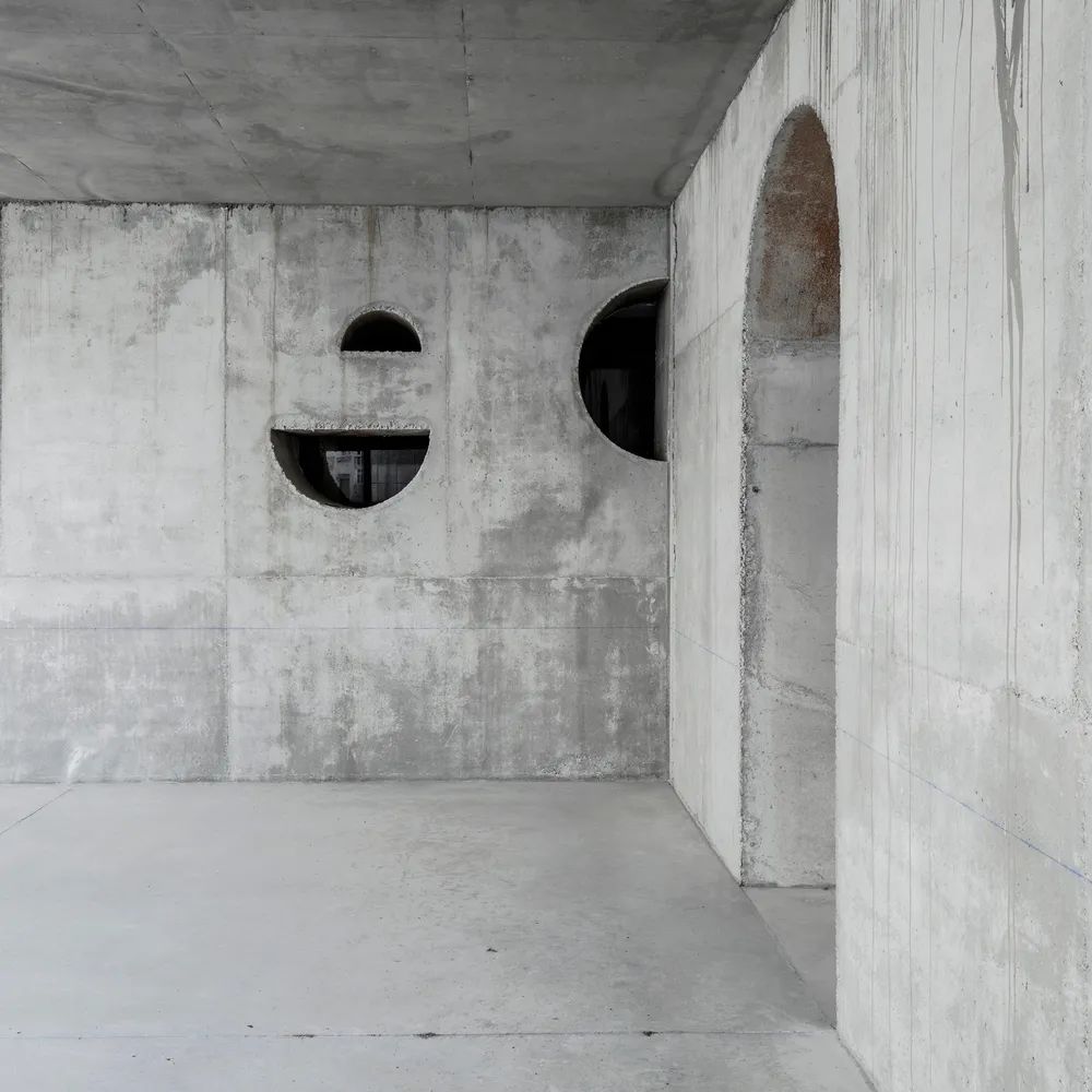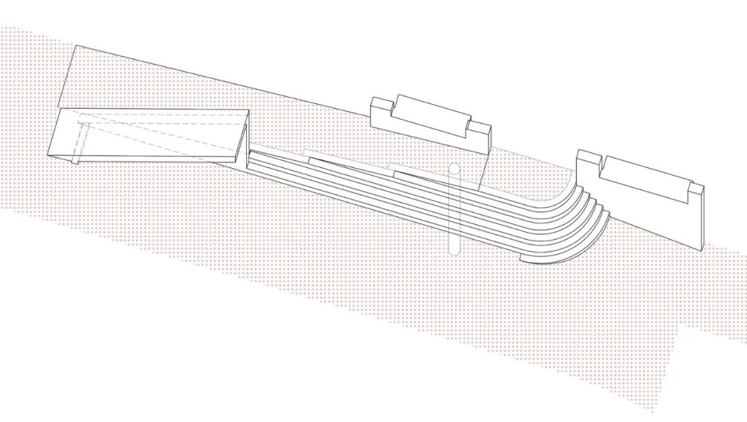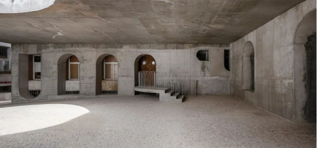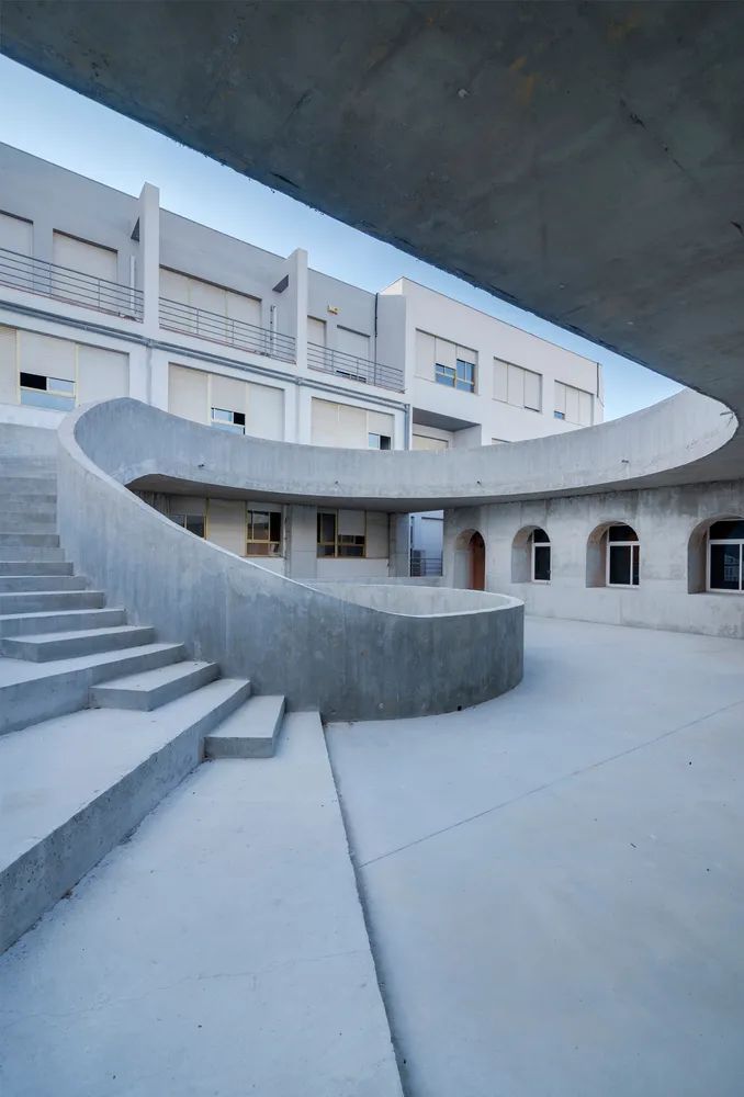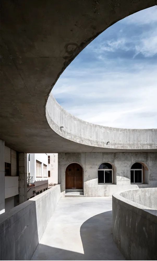 此一建築架構彷彿僅有骨骼,而並沒有肌肉和皮膚。它從地面中升起,以兩堵牆與建築物主體相連,以此為庭院打造了一個全新的標識,並用一種獨特的語言改變了原先荒涼的建築空白。