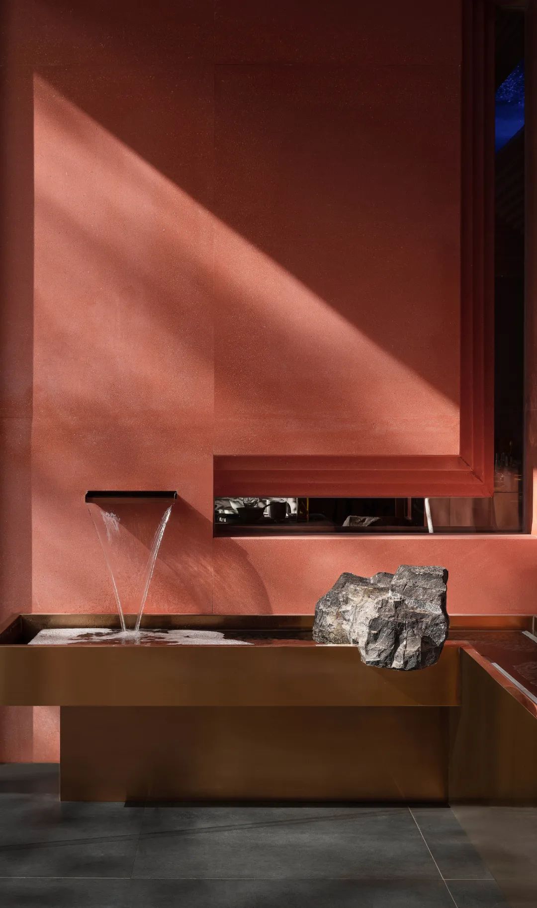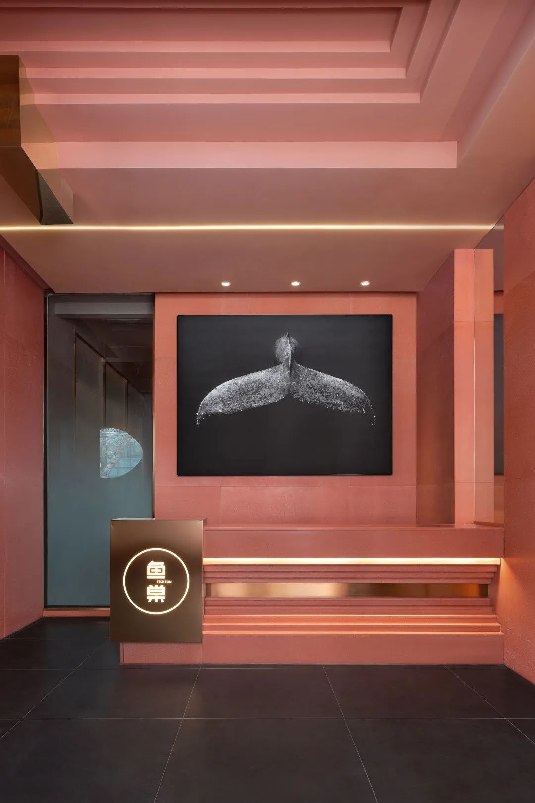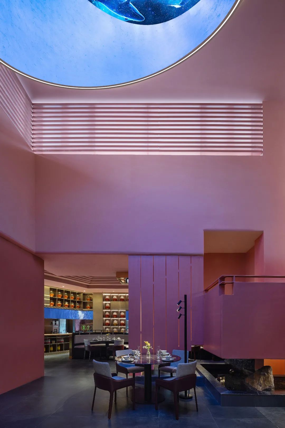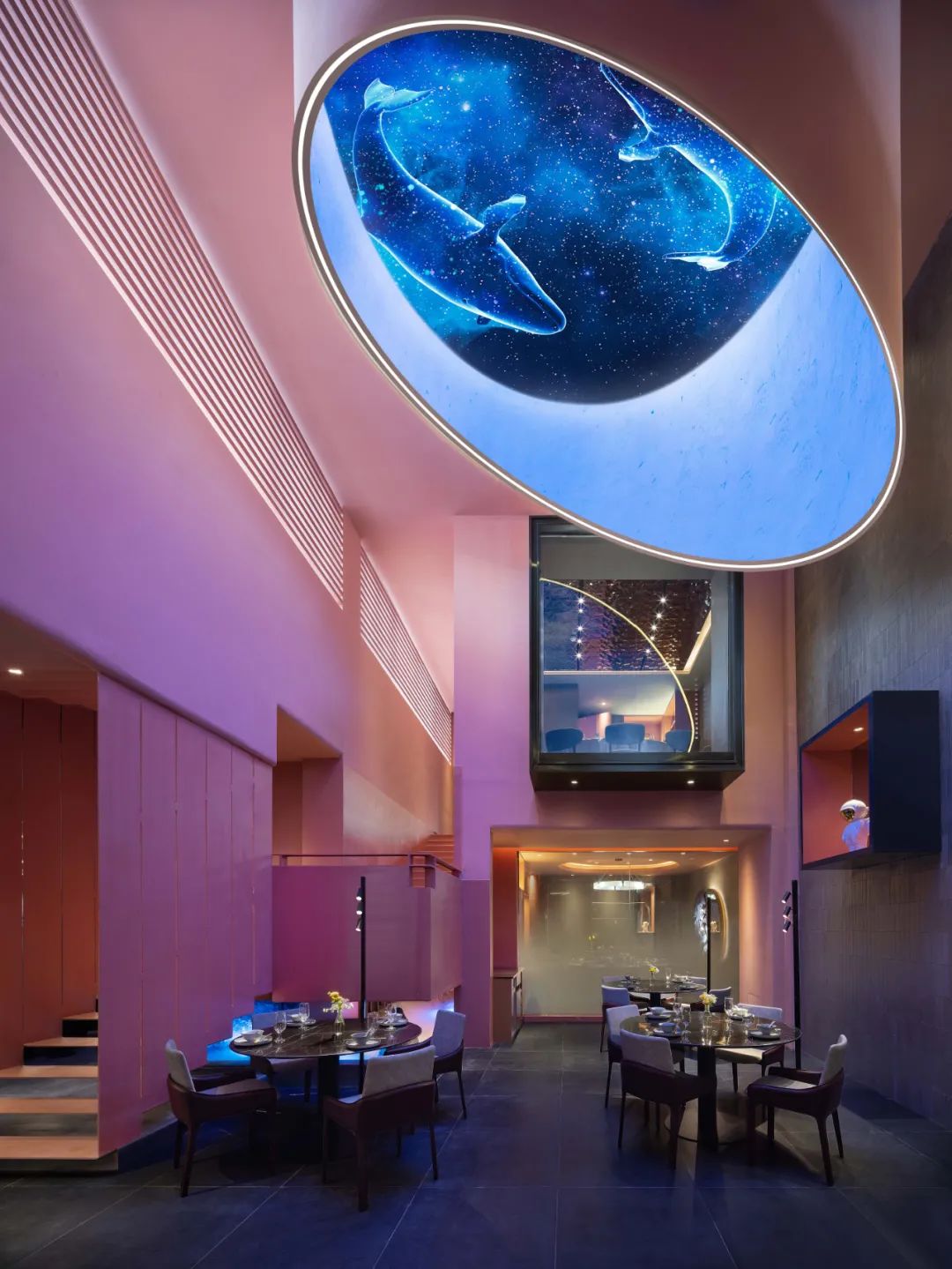 空間不僅承載著機能需求,更呈現著人們形而上的追求,無論是頭頂鯨魚游弋的圖景,象徵日月的光影,抑或是涓涓不停的水流皆是人們精神追求的具象寫照。