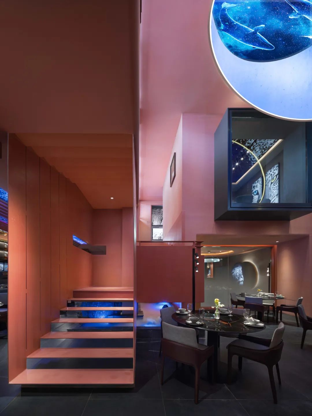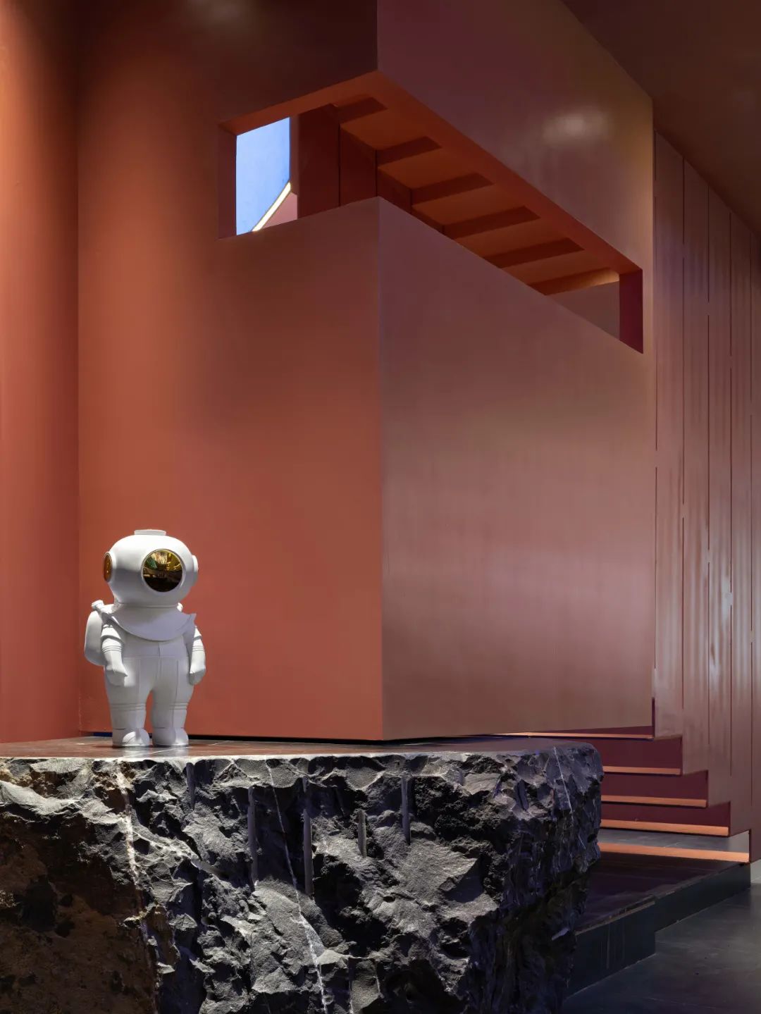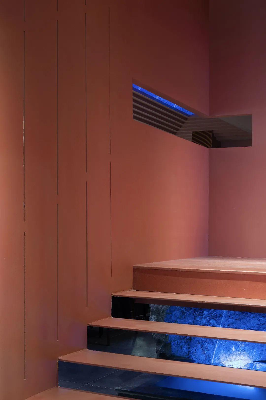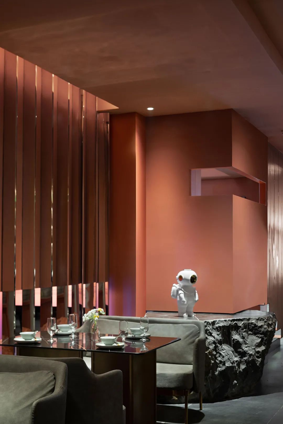 餐廳整體的色調採用「火星紅」的顏色,並運用代表永恆的直線,去塑造可能存在於某個未知星球的峽谷般地貌。神秘而又無處不在的金屬方碑,致敬了科幻經典《2001太空漫》中的黑色方碑。