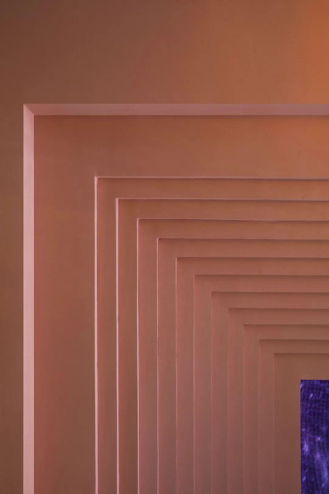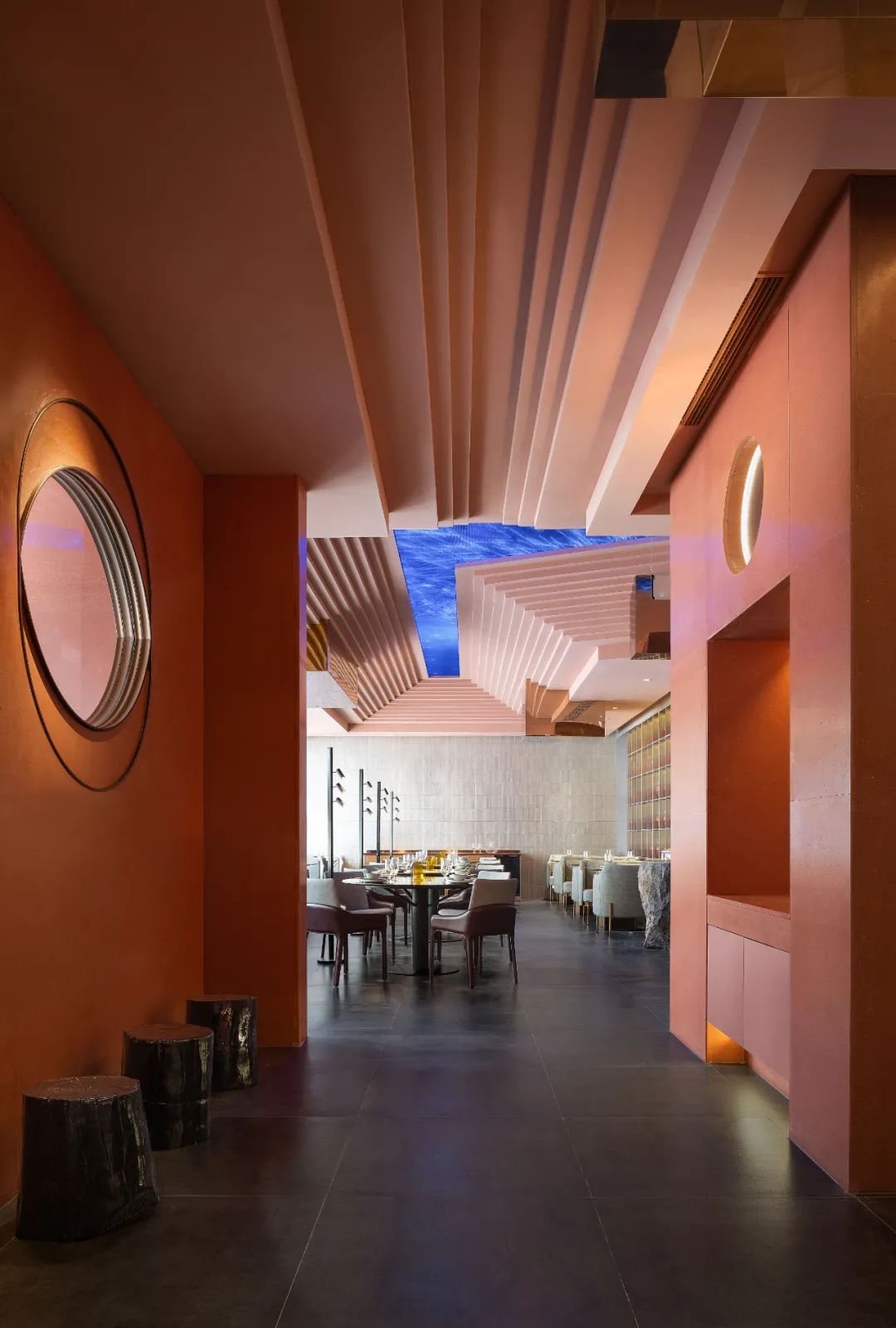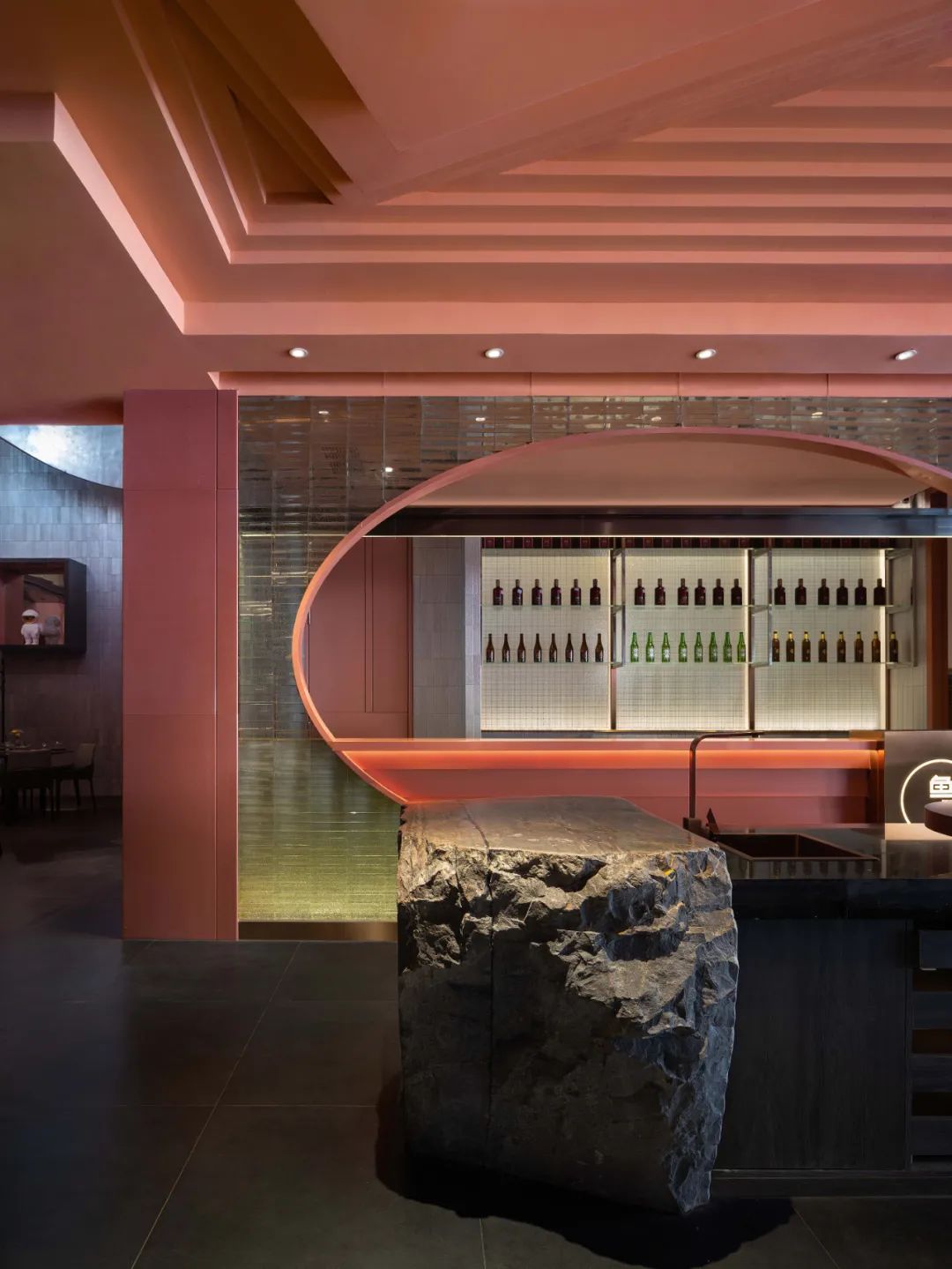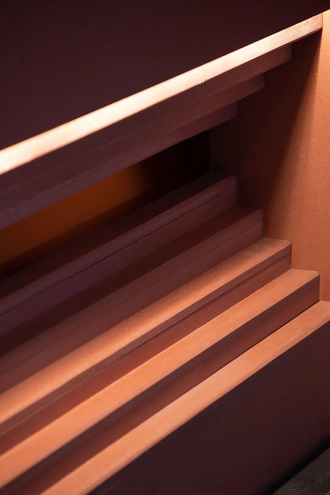 餐廳整體的色調採用「火星紅」的顏色,並運用代表永恆的直線,去塑造可能存在於某個未知星球的峽谷般地貌。神秘而又無處不在的金屬方碑,致敬了科幻經典《2001太空漫》中的黑色方碑。