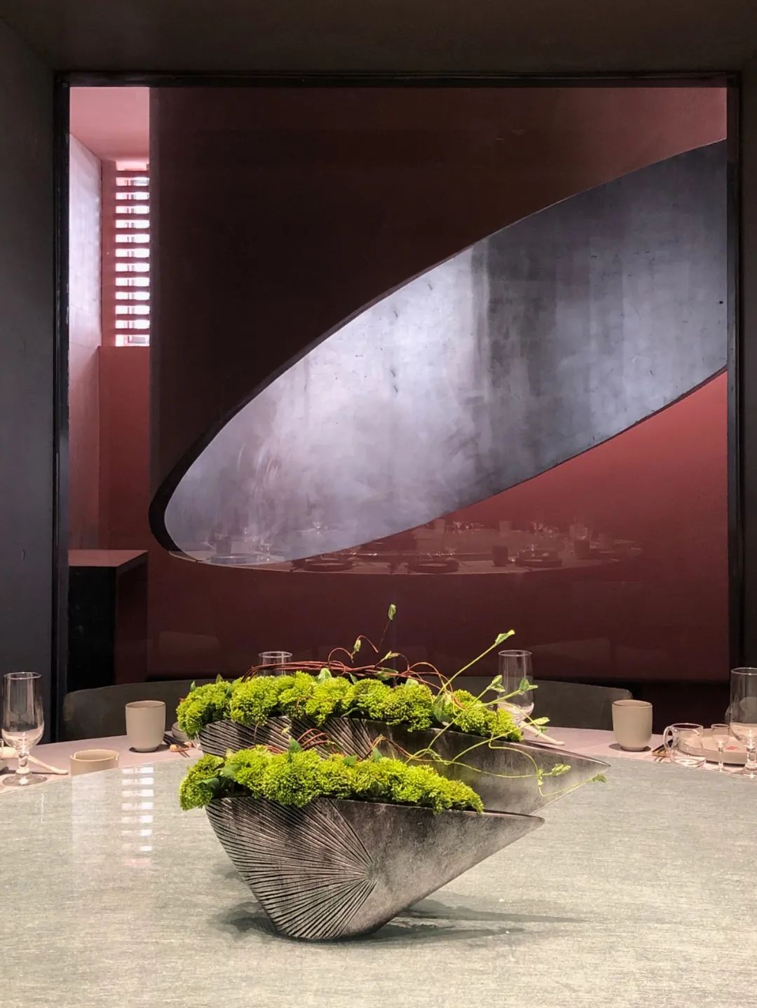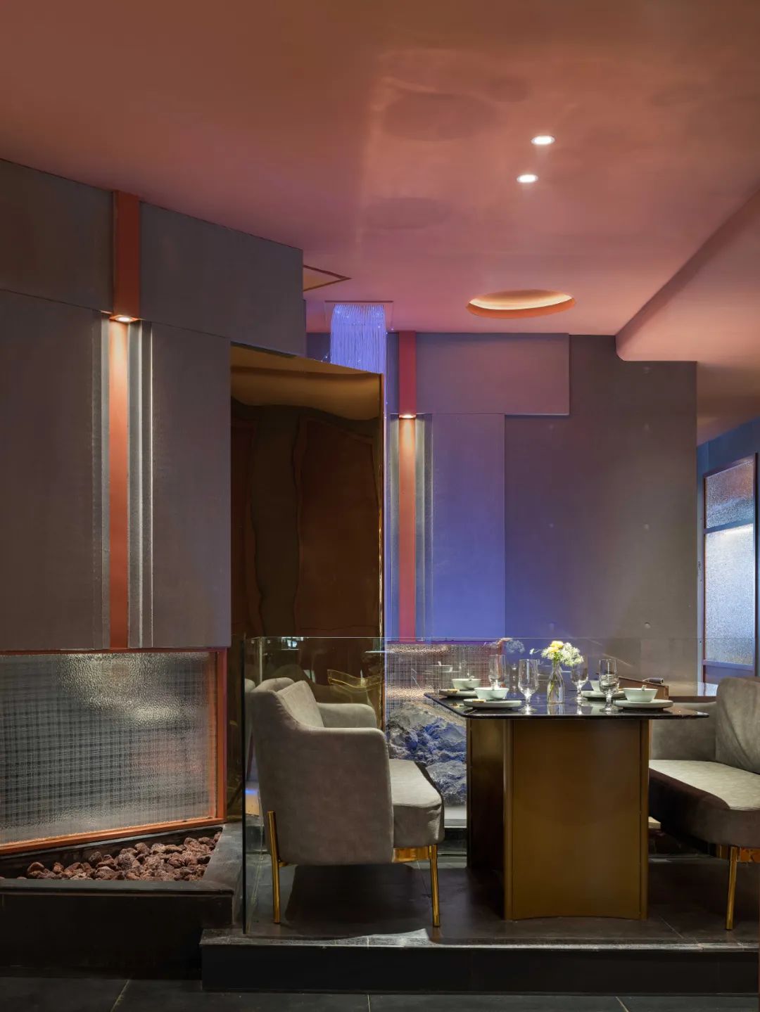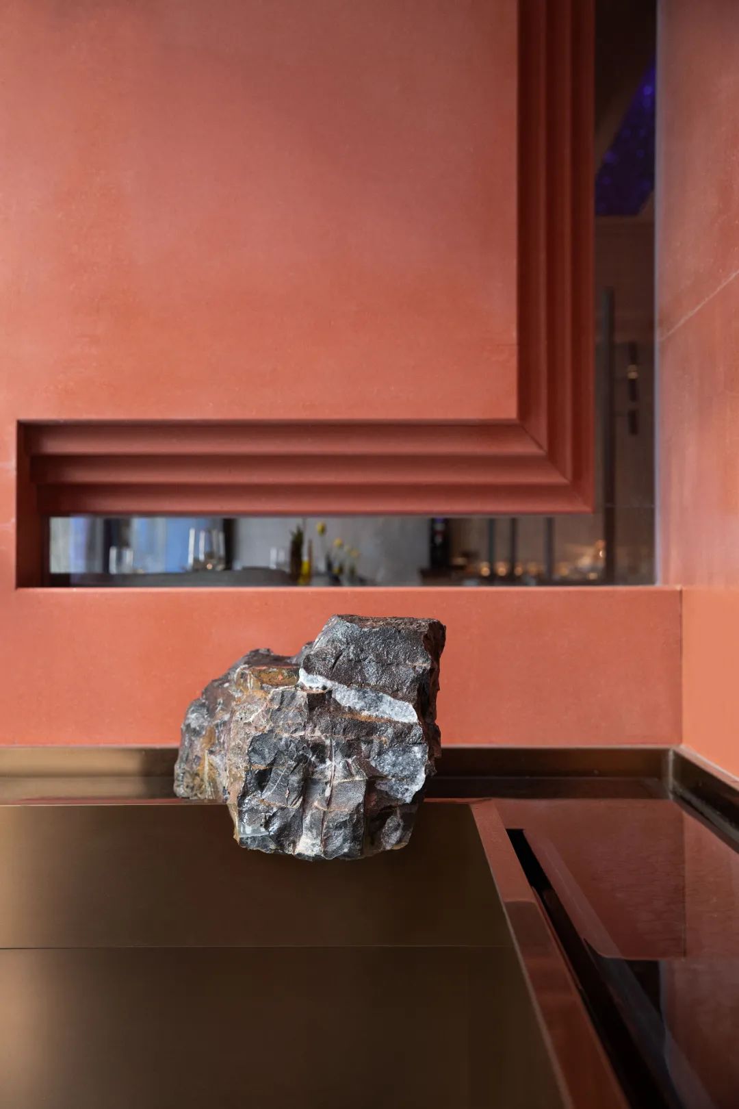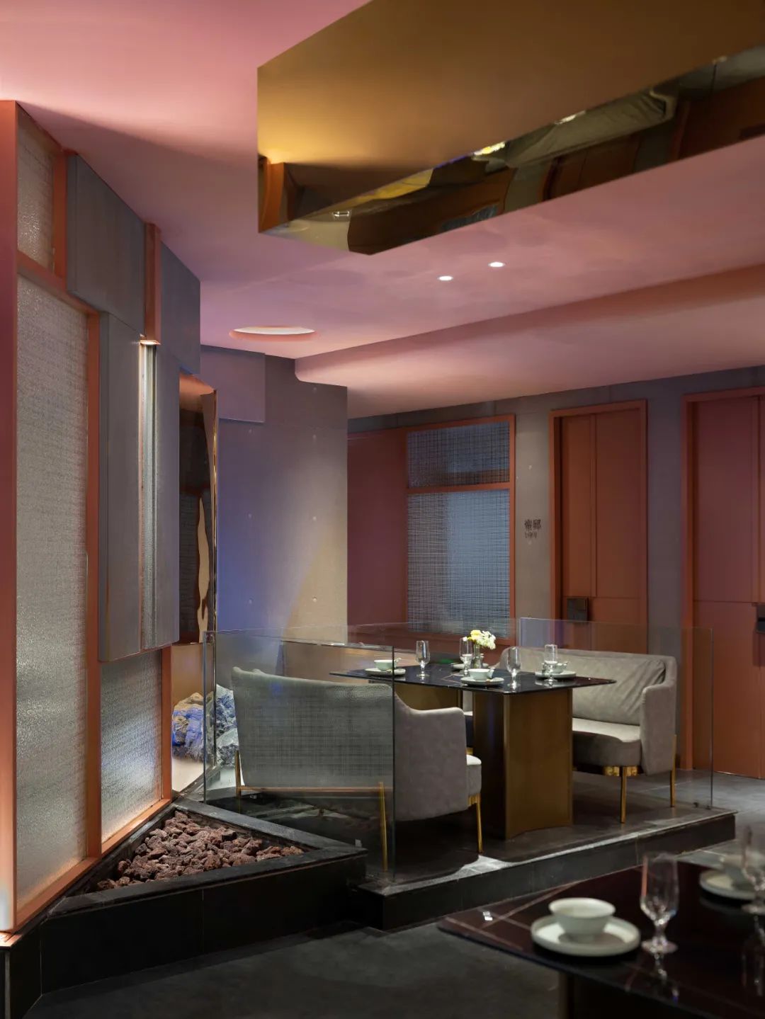 餐廳整體的色調採用「火星紅」的顏色,並運用代表永恆的直線,去塑造可能存在於某個未知星球的峽谷般地貌。神秘而又無處不在的金屬方碑,致敬了科幻經典《2001太空漫》中的黑色方碑。