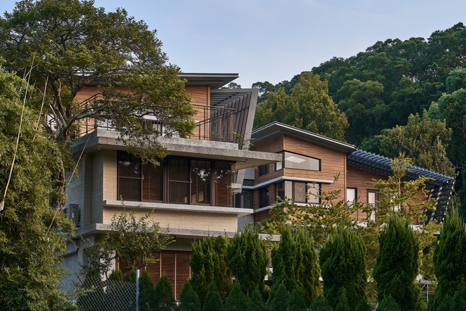 依據三代同堂的家庭成員生活空間及使用劃分為三個核心單元,建築配置的錯落,圍塑出多個庭院空間,讓景觀自然融入其中。以遮陽花架及深出簷的設計解決基地的西曬問題,更創造出室內外相互延伸的活動平台空間。順應山勢的屋頂造型,呼應了山峰疊巒的景觀意象,並漸少山林間風切的聲音。