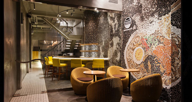 從餐館的招牌菜即骨湯拉麵中獲取靈感,將分隔樓梯與大廳的屏風設計成波浪形,像極了一根根拉麵。