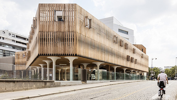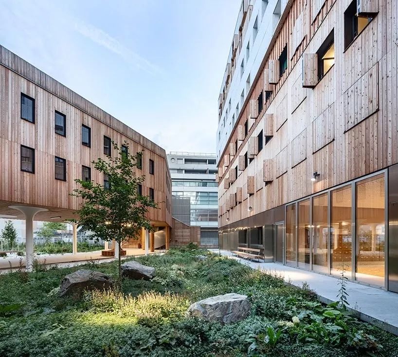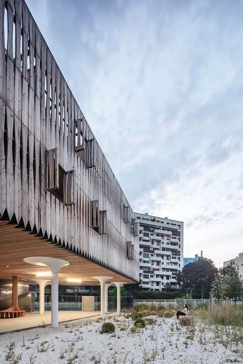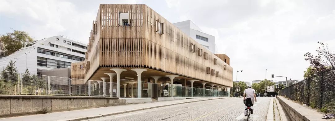 在設計立面時,建築師們試圖在構成該地區各層的各種建築原型之間建立一種聯繫。該建築的一側面向「巴黎國際大學」,與La Maison Des Arts Et Métiers互動,創建由各種水平層組成的立面融合為「Faubourg(法語,意指「市郊」、「郊區」)」式建築,地面層以通透或玻璃作為空間區隔,提供了寬敞與輕盈量體的感覺,其上三個樓層以落葉松木複合材料作為外皮層,最頂層立面則由沖孔鋁板覆蓋。