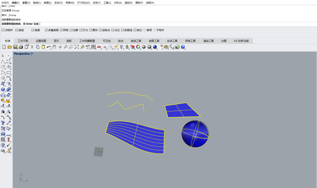 點擊該指令:選取數個要成群組的物件(曲線、曲面、多重曲面或或網格)——按Enter結束指令