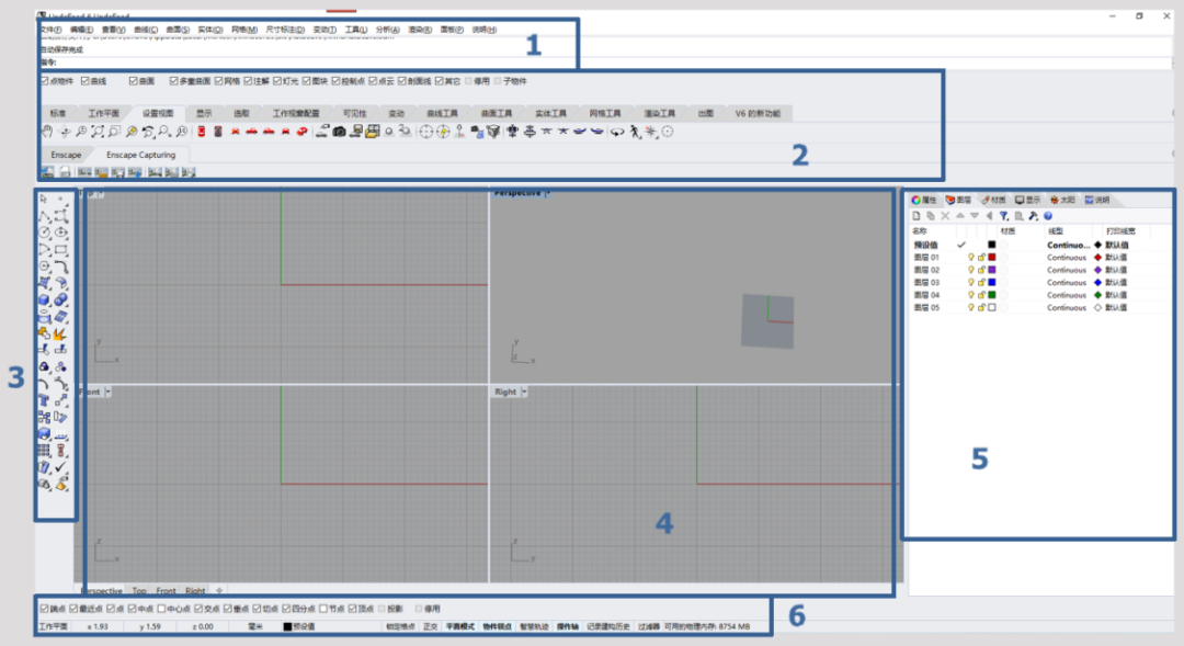 在犀牛的初始界面中,我們分為了一下幾個部分: