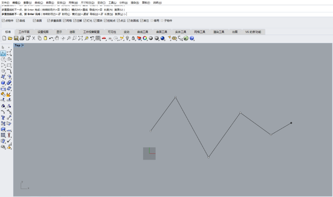 點擊該指令:指定第一個線段的起點 — 指定第一個線段的終點(同時這個點也是下個線段的起點) — 指定下個線段的終點 — 繼續指定其他的點完成多重直線,按Enter結束。