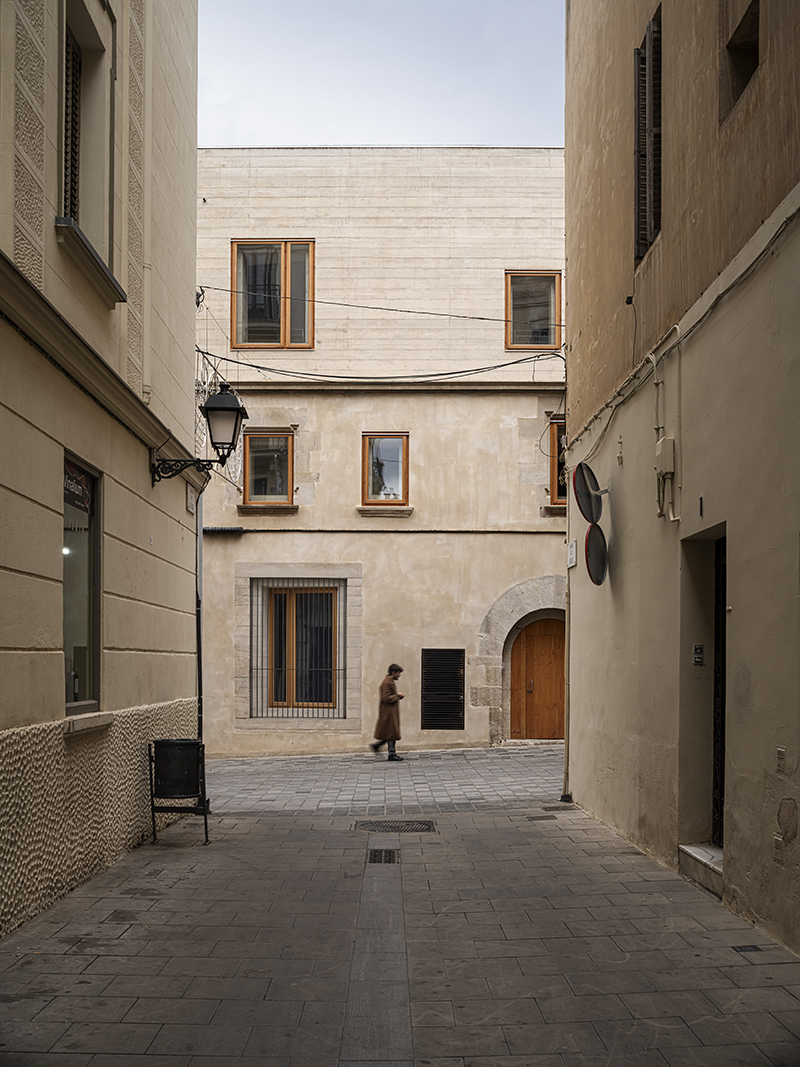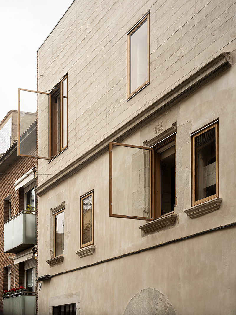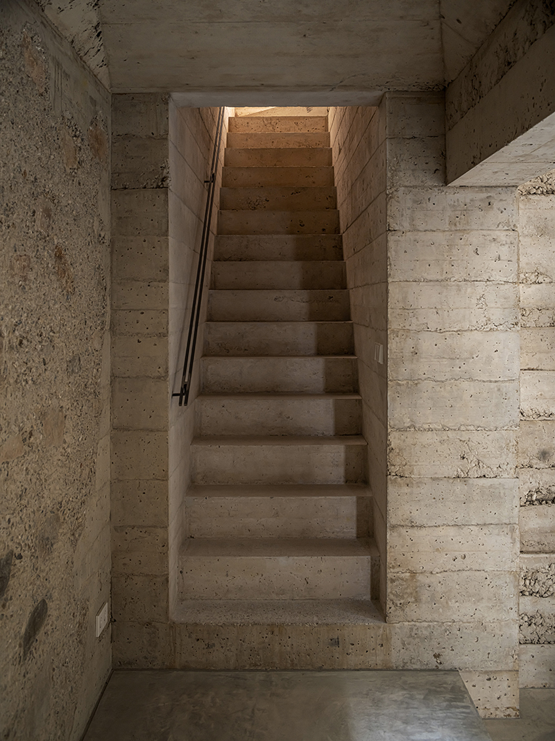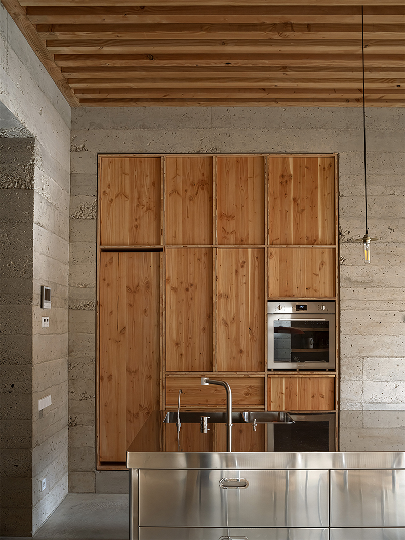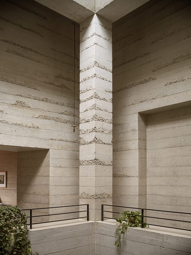 1736 House 的牆壁,不僅是用來分隔空間,更是調節室內環境的重要元素。HARQUITECTES 團隊採用了厚重的結構牆,這些牆體以「貧混凝土」(poor concrete)澆置而成,這種混凝土的成分,包含少量的水泥和細沙和骨材,再利用類似夯土的技術進行壓實,創造出堅固且具有高熱慣性(Thermal Inertia)的牆體,可以有效地調節室內的溫度和濕度,同時也能吸收聲音,創造更舒適的居住環境。