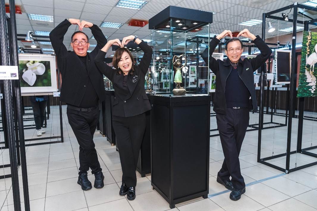 三位企業主說自己是素人藝術家 (左起)麗明營造董事長吳春山、龍寶建設董事長張麗莉、生產力建設董事長張忠弘