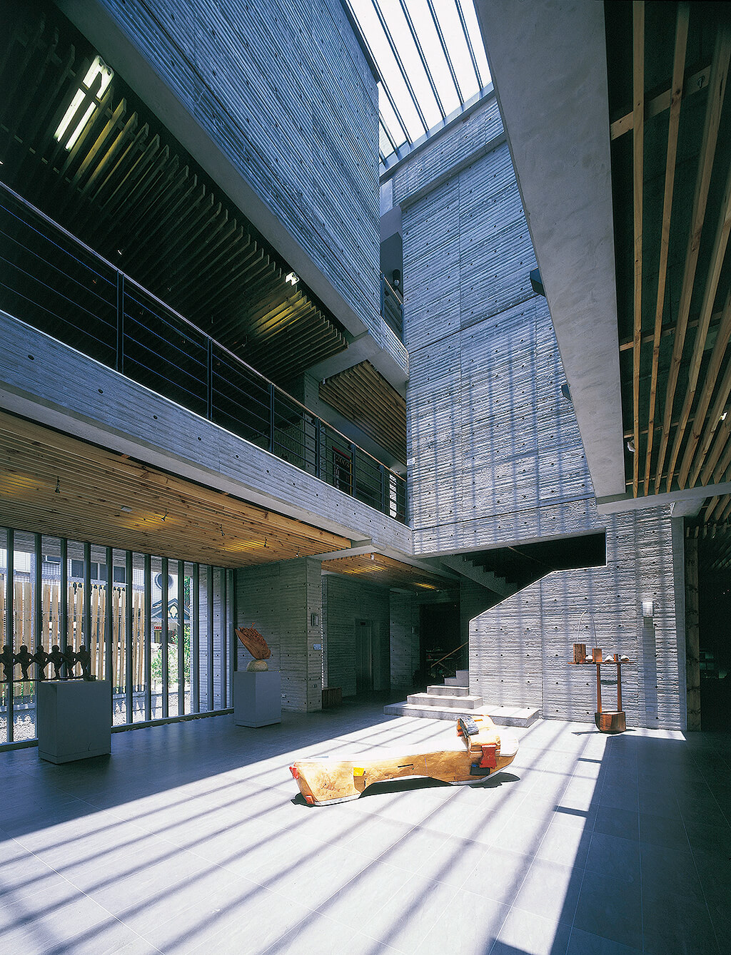 另外,將演講廳如木盒般地嵌入混凝土的作法也相當有創意,而挑空內庭讓光線輕易就可進入,並隨著不同時段的光影變化照映在清水模木紋上變化萬千。