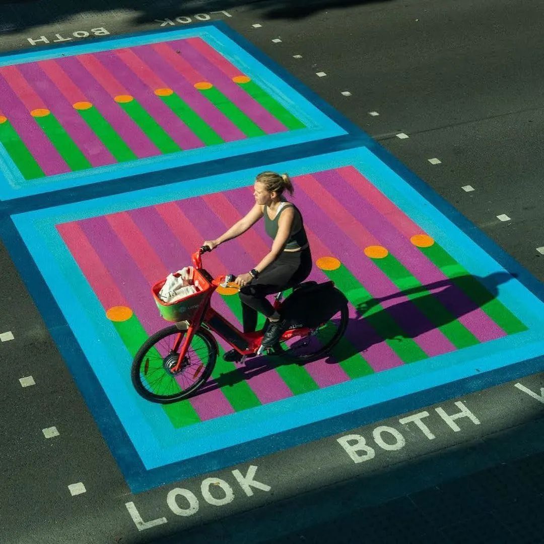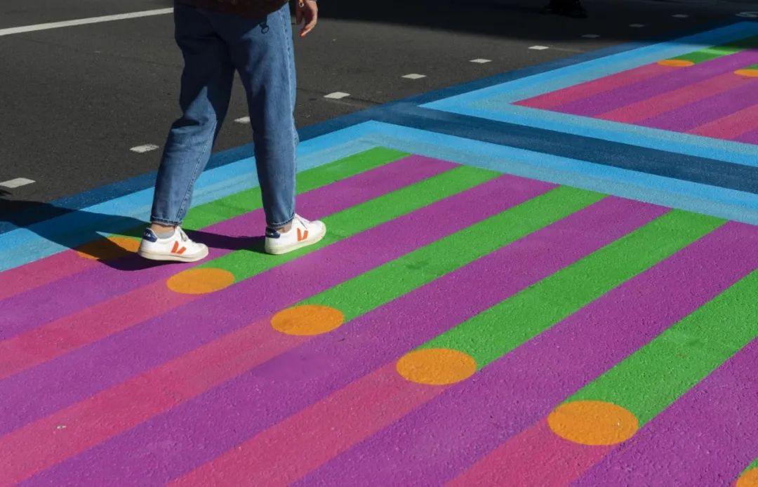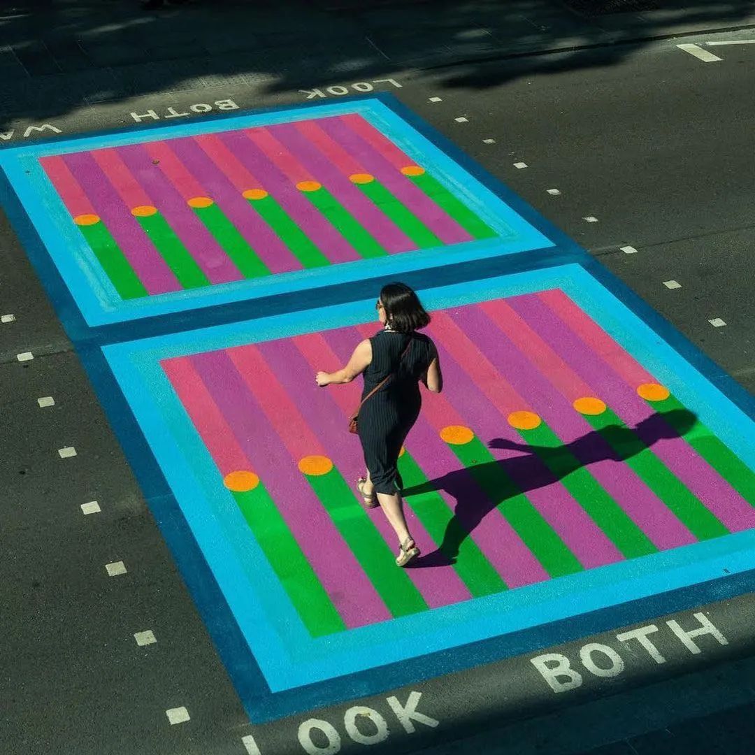 Yinka Ilori 將市中心法院路一共11 個十字路口用藍色、橘色、粉紅色、紫色和綠色的大膽色調取代了通常的黑白條紋。設計師還與倫敦藝術大學的學生合作,為倫敦的金融、商務區設計了另外7個十字路口,其中一個在 Bloomberg的總部,Bloomberg 也是此作品的贊助商。