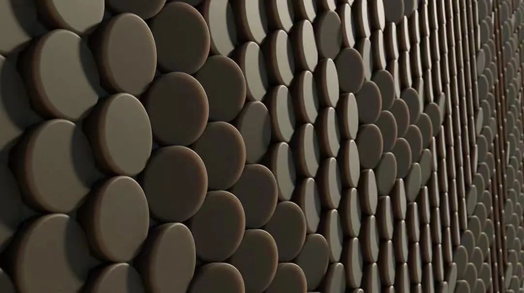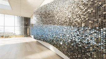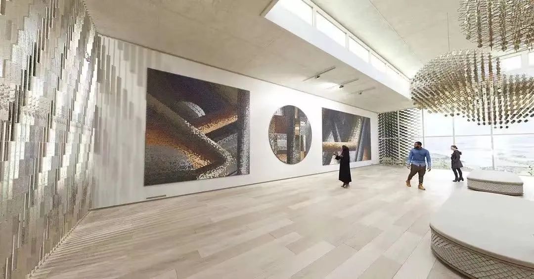 深入虛擬展廳,是公司各種材料組成的雕塑畫和雕塑牆。其中左手邊的一圓兩方的幾何藝術品由數以千計的高光陶瓷 「像素片」 製成,它們翻出不同的角度,呈現出不同的色澤和陰影,進而形成一種圖案。