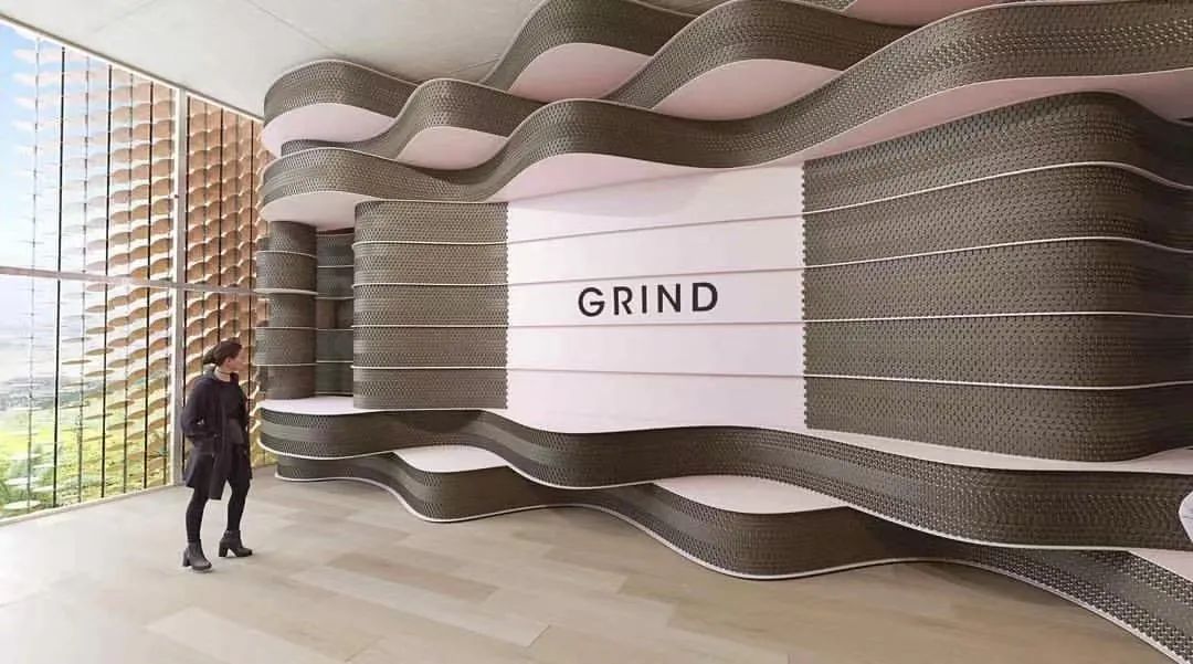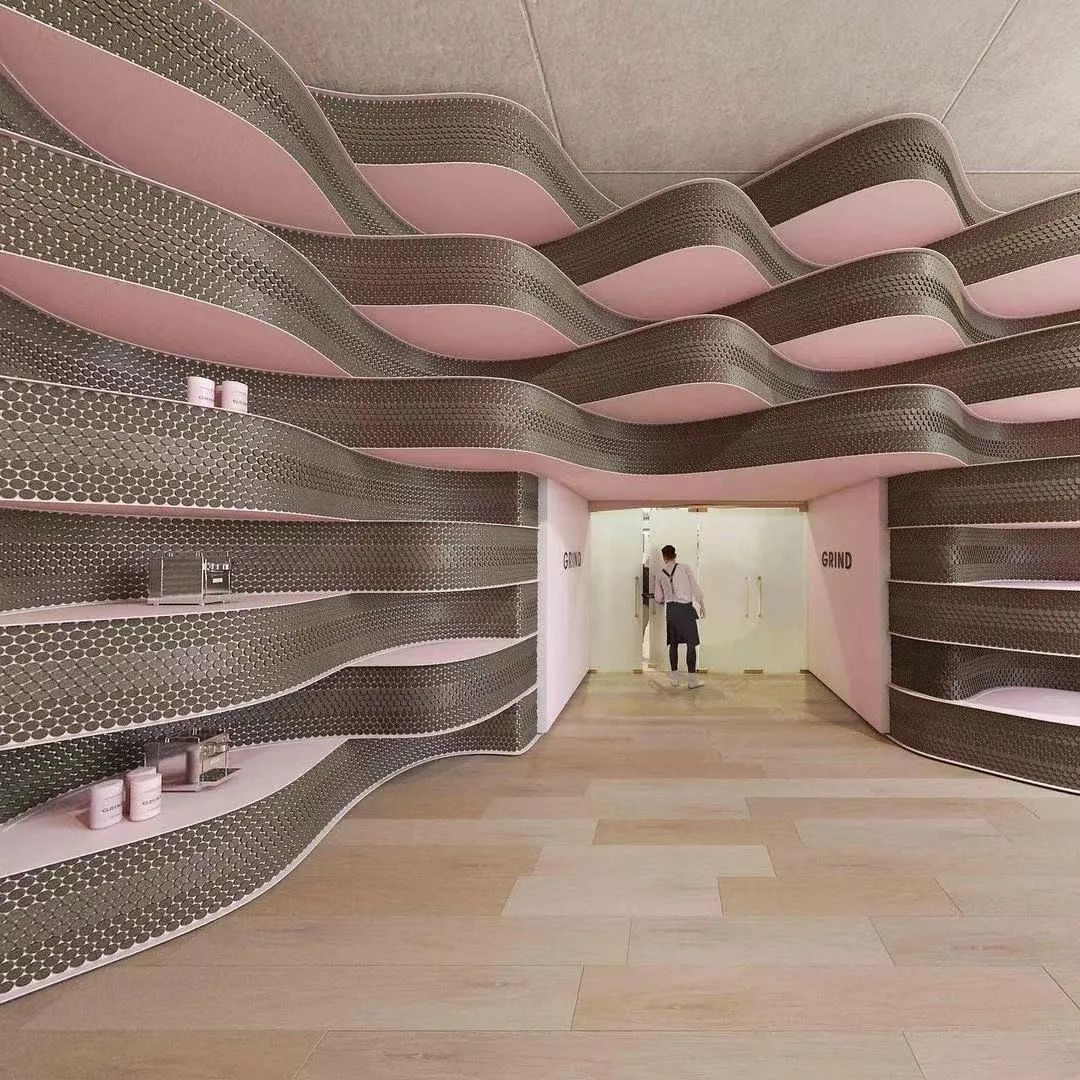 進入右手邊以咖啡品牌 Grind 為主題的展廳,是頗為震撼的滿牆的咖啡渣製成的波浪形咖啡擱架。Giles Miller Studio 與義大利材料創新專家 High Society 共同合作開發了新咖啡「鱗片」——這些「鱗片」是由英國咖啡行業的廢料製成的。「鱗片」以相反的方向傾斜,以創造空間內起伏的建築擱架的色調變化。
