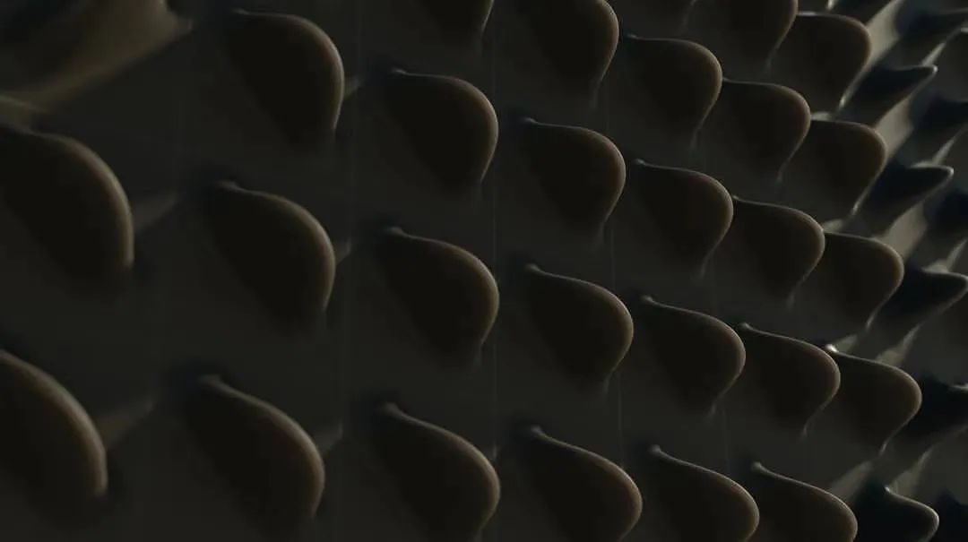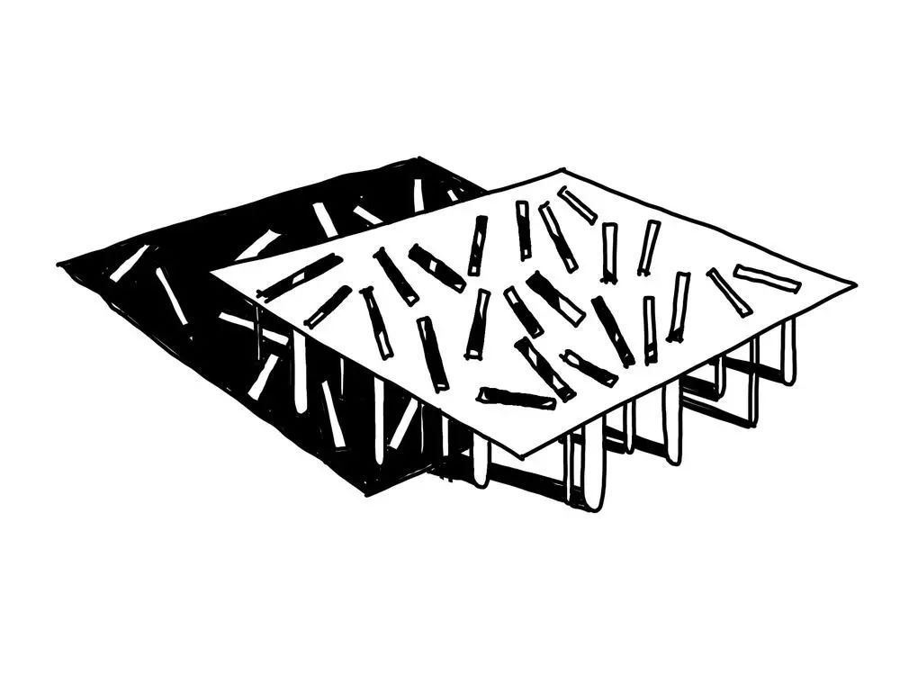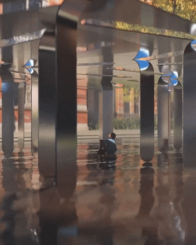 設計師使用板材並採取最少的切割和彎曲,將 2D 對象轉換為複雜的 3D 空間。結構是自支撐的,儘管其外形極薄,但利用了鋁的先天強度。由此產生了一個人造的反射「森林」,設計師用非自然的材質模仿了自然環境,光影隨著全天變化,懸浮在天空和水之間。