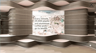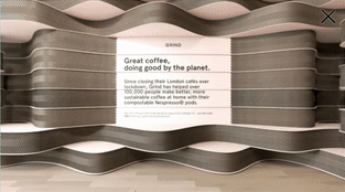 就像「Medusa」的混合虛擬空間一樣,本次倫敦設計節因為考量到疫情的影響,仍有很多人沒有辦法現場參與,所以舉辦了很多線上虛擬活動。比如由建築與設計工作室 Giles Miller 與建築可視化公司 Lucid Environments 開發的全球均可登錄的線上展廳— V-Gallery。它將工作室的建築與雕塑作品搬到線上,並與倫敦本地的咖啡品牌 Grind 合作,線上展示了由咖啡渣製成的永續發展的咖啡吧及如雕塑般的牆面。