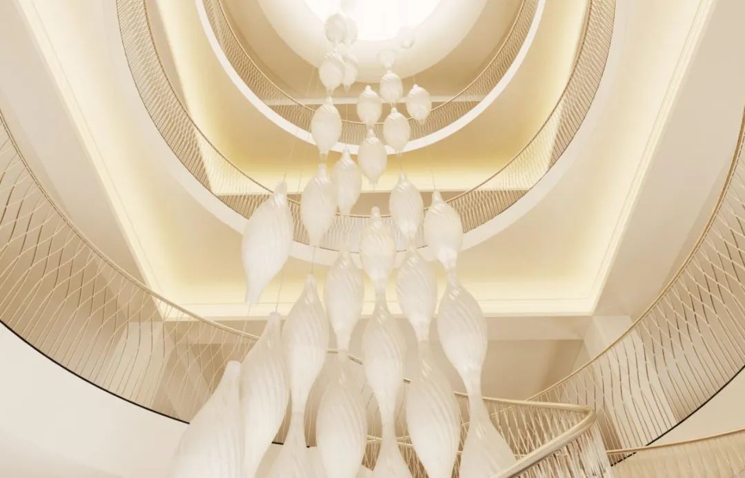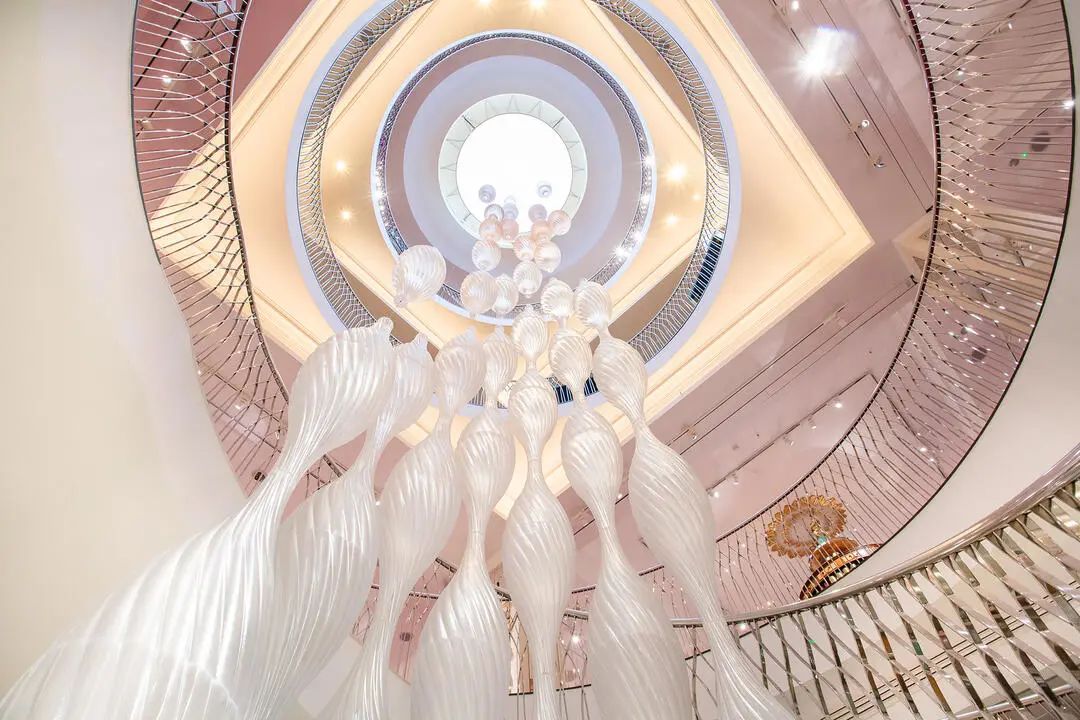 天花板上圓形的金屬亮片燈,就像一個個矩陣,代表著二元、統一和平衡的主題。