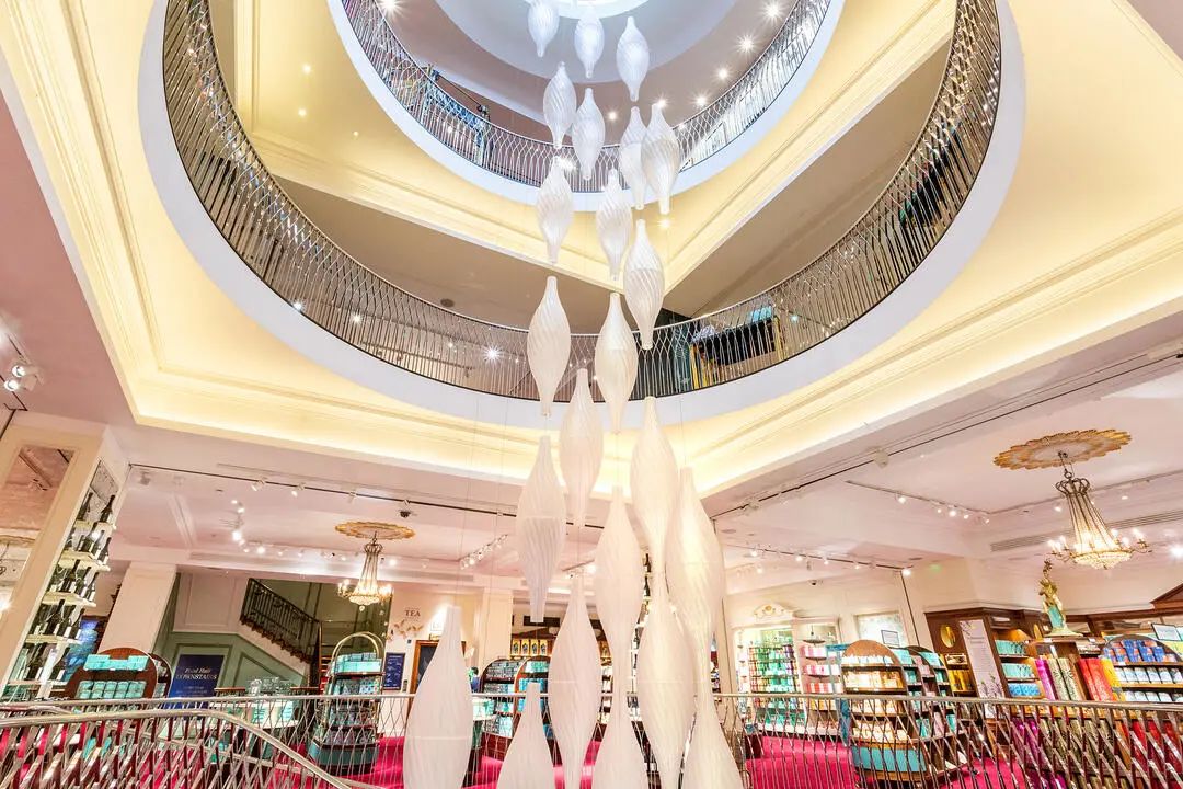 3D 列印模組沿著中庭向上延伸到由生物塑膠製成的照明天花板,該裝置的組件由發酵糖製成,完全可堆肥,本著循環經濟的精神,活動結束後可重複使用。節日後這些組件將進行出售,以籌集資金支持英國的蜜蜂種群,其中 25% 的收益將捐贈給 Bees for Development。