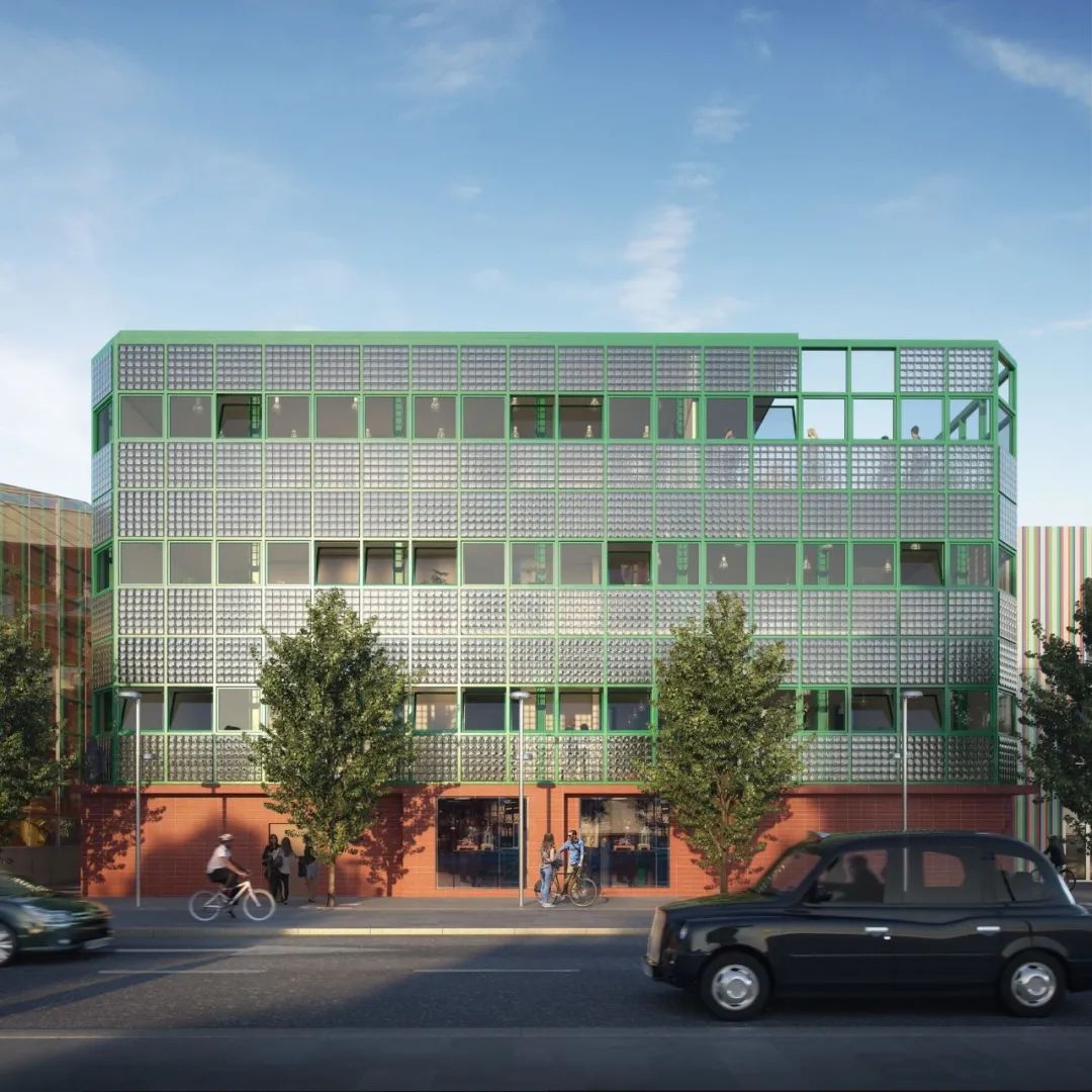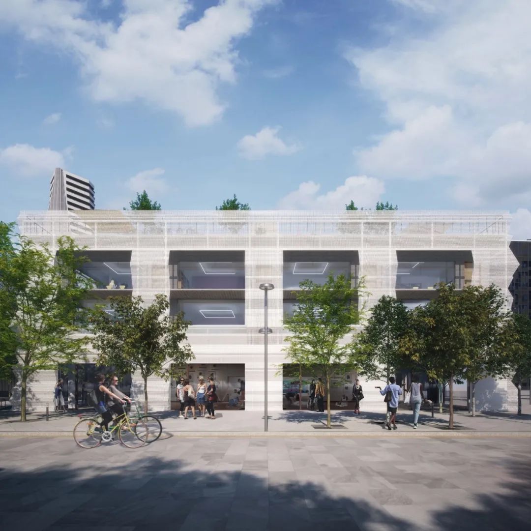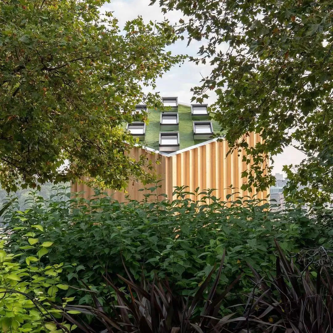 兩座建築均採用金屬包覆:C2 採用引人注目的 CorTen 耐候鋼(耐候鋼是一類合金鋼,在室外暴露幾年後能在表面形成一層相對比較細緻的鏽層,因而不需要塗油漆保護),D2 帶有彩虹色漆面,可隨光線改變顏色。外部格柵窗讓每棟建築在夏季保持涼爽。C2 將為食品和飲料行業的工作人員配備測試廚房和工作室,而 D2 將提供工作室和辦公空間。Mole Architects 的建築表達了對顏色、形式和材料品質的熱情。