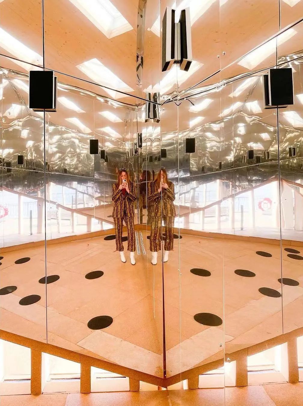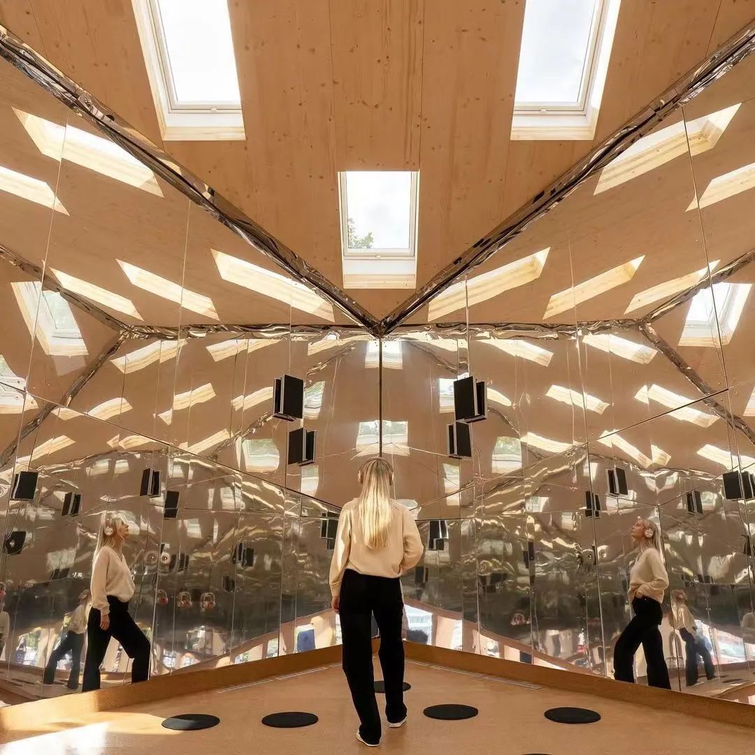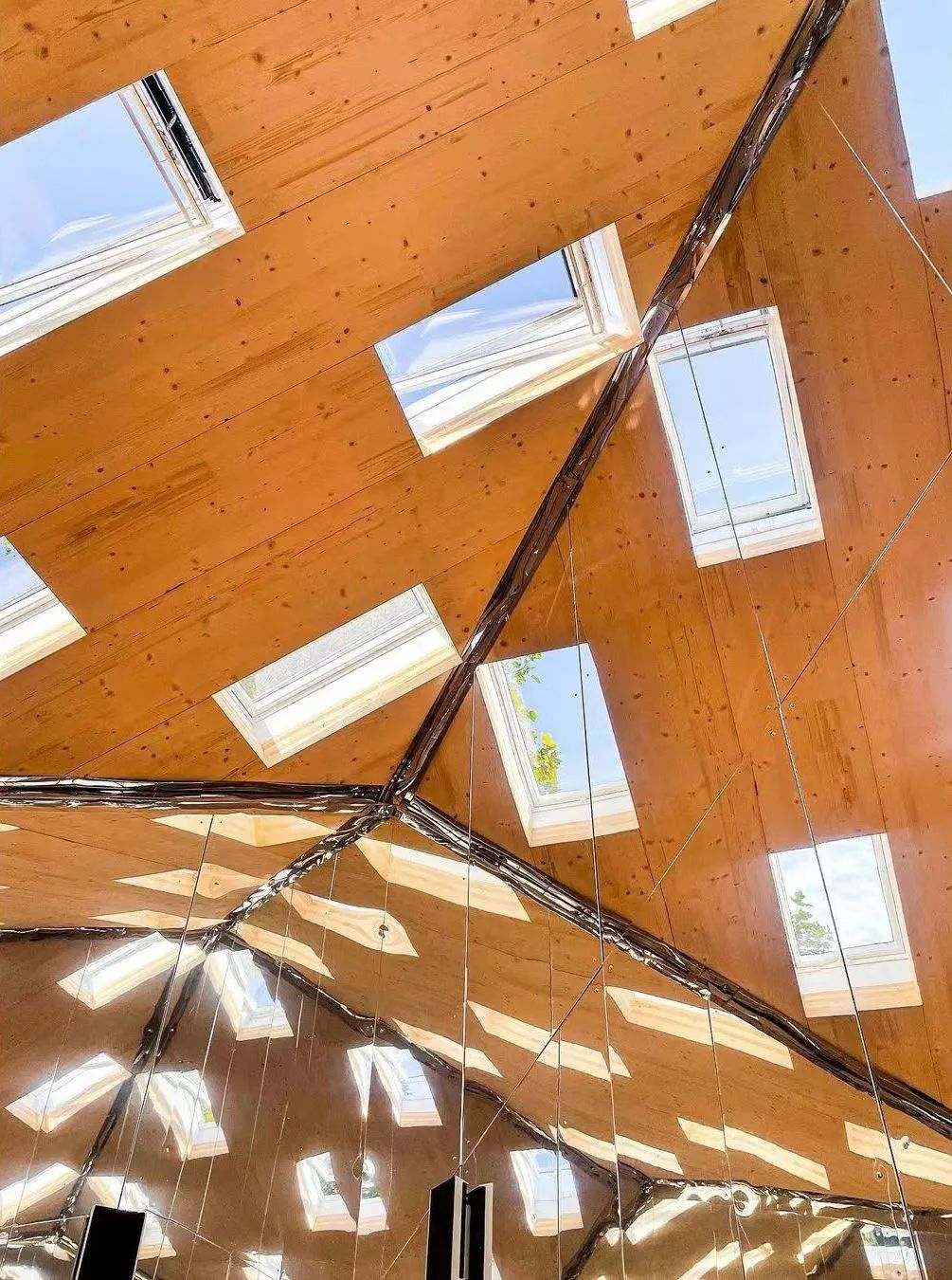 其木製外觀與充滿鏡面的室內產生對比,整個建築有點像個方形的萬花筒,鏡面反射了屋頂的9扇 VELUX 的天窗和窗格中的天空。訪客可以採取 VELUX Active 應用程式控制屋頂窗戶的開合 – 或者只是在窗戶打開和關閉時享受不斷變化的光線模式的美感。