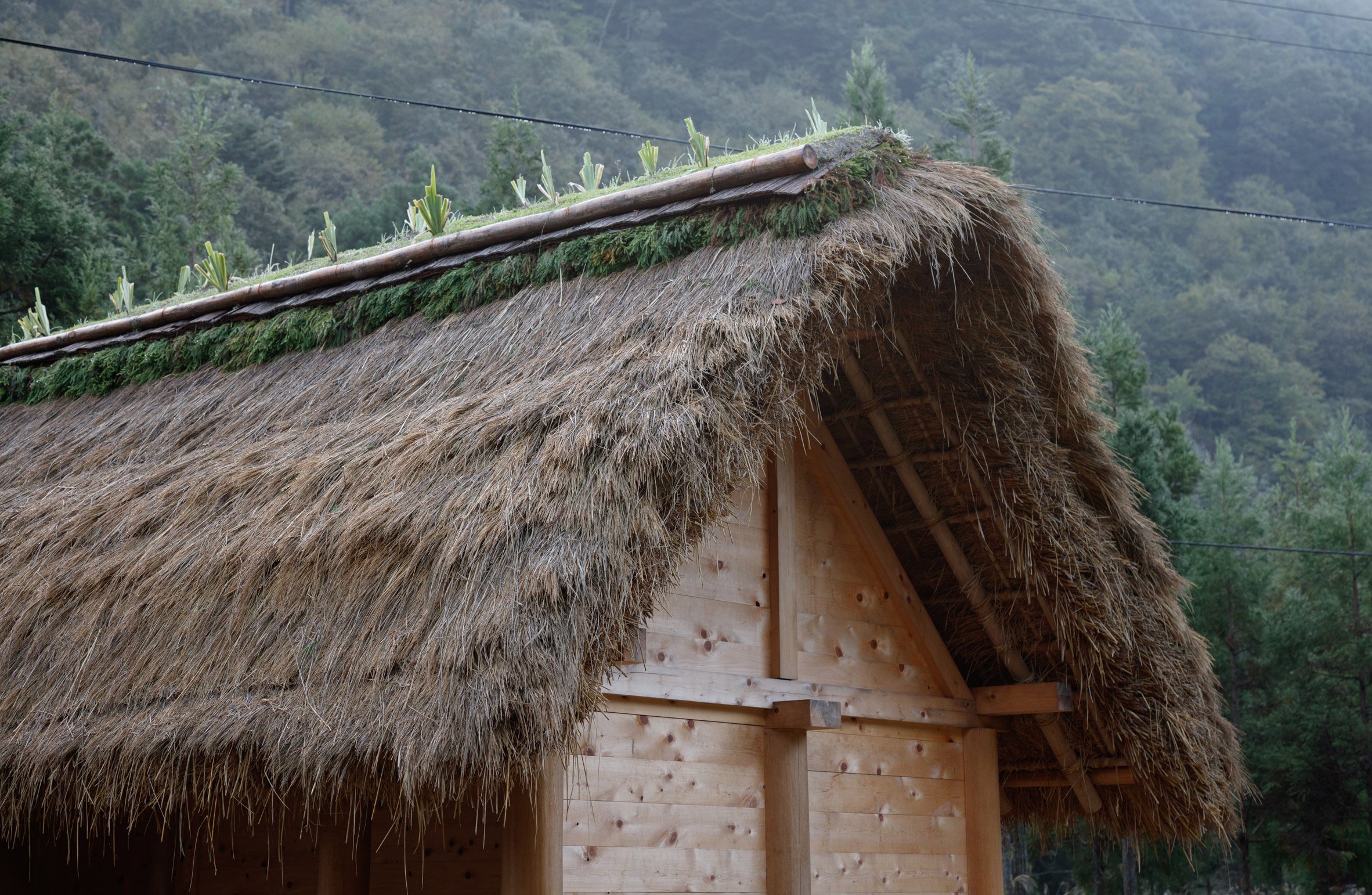 建築師選用此木材,並以手工塑形、傳統榫接方式組裝於石造基礎之上,顯見其對材料特性與傳統工法的尊重 。屋頂部分則更是淋漓盡致地展現了自然材料的多樣性:以傳統茅葺(kayabuki)技法,將稻草層層鋪疊於竹製網架上,再覆蓋杉樹葉、杉樹皮與土壤。這些材料幾乎全部源於周邊土地,顯見 2m26團隊「取之於大地」的原則,也大幅降低了運輸需求與隱含能源消耗,尤其在僅能徒步運送的條件下,更顯其資源效率。