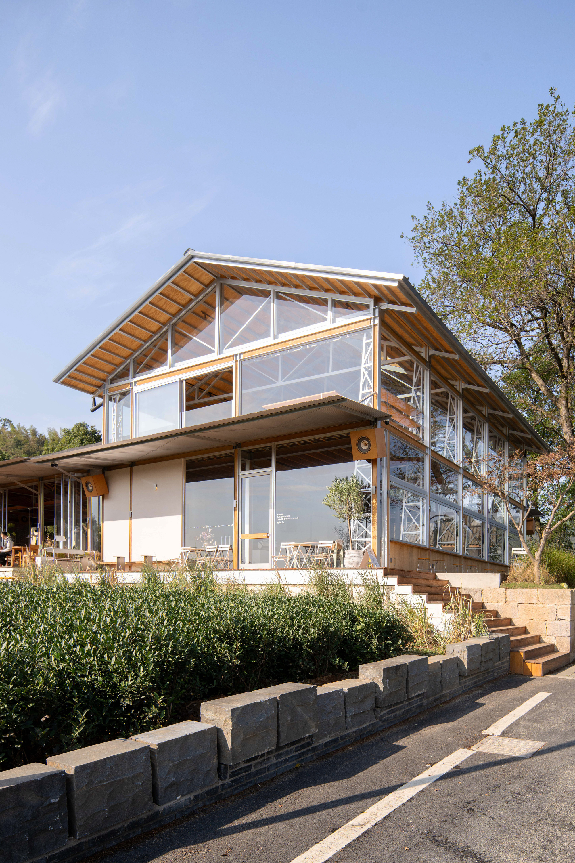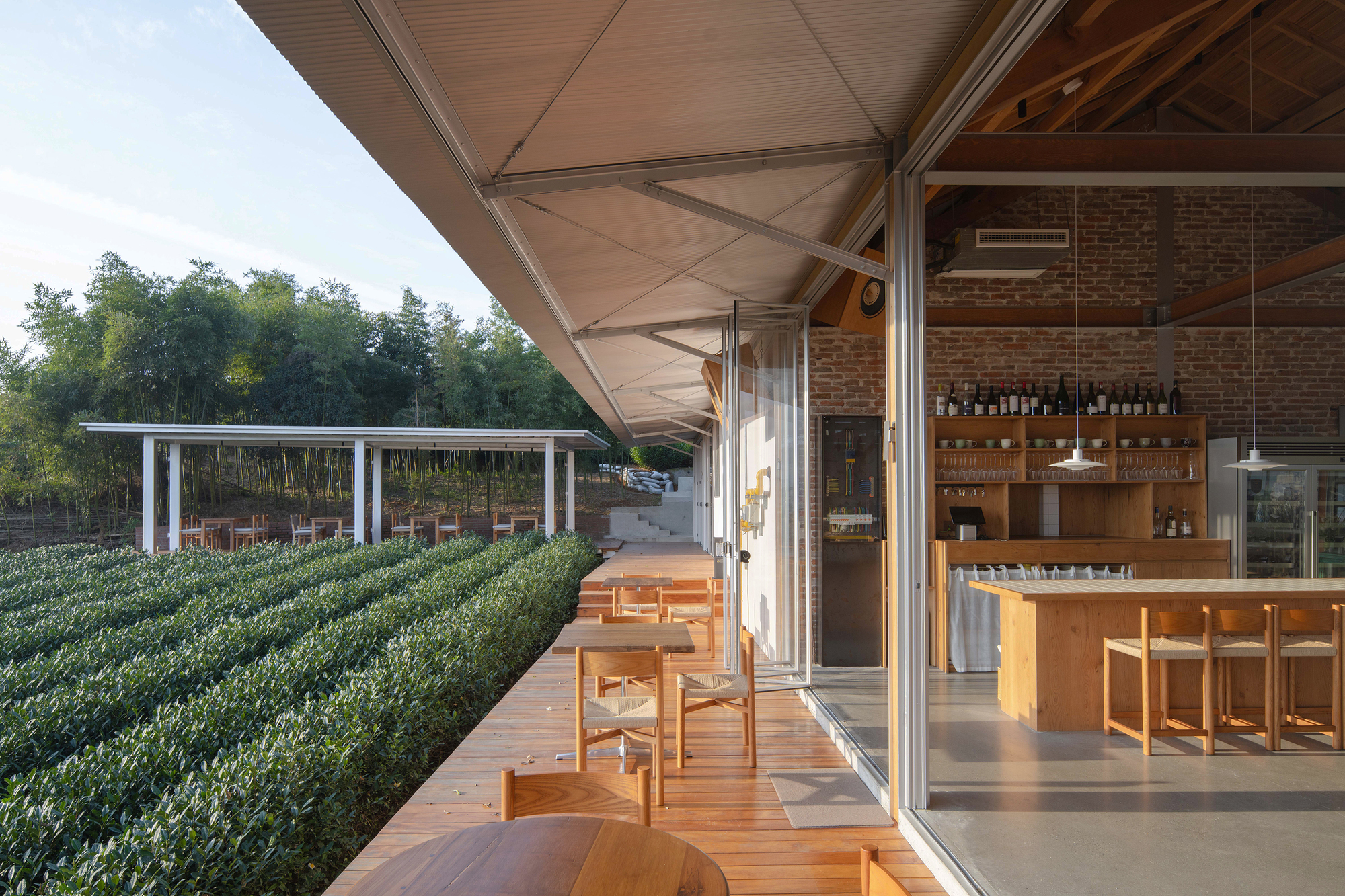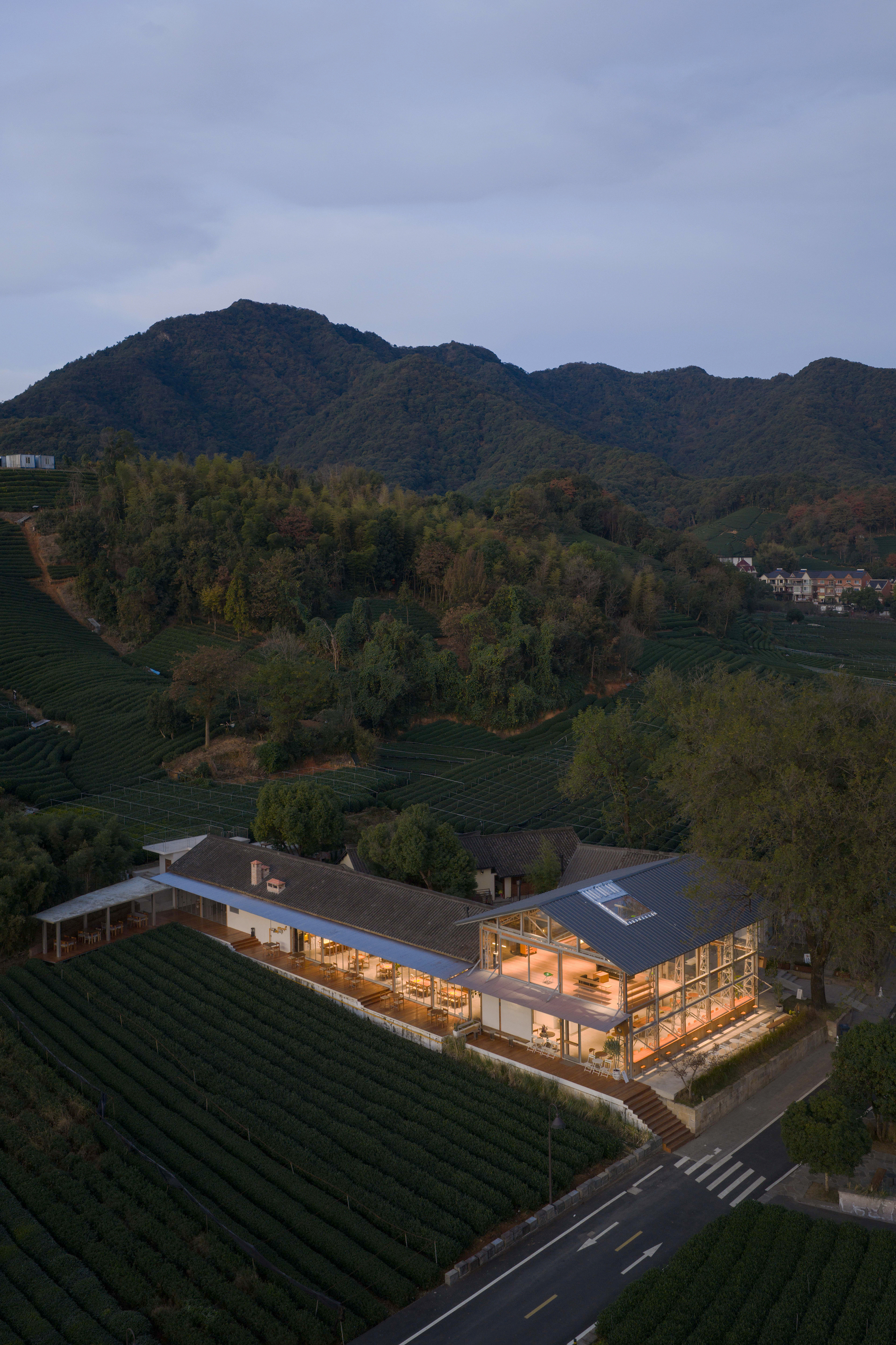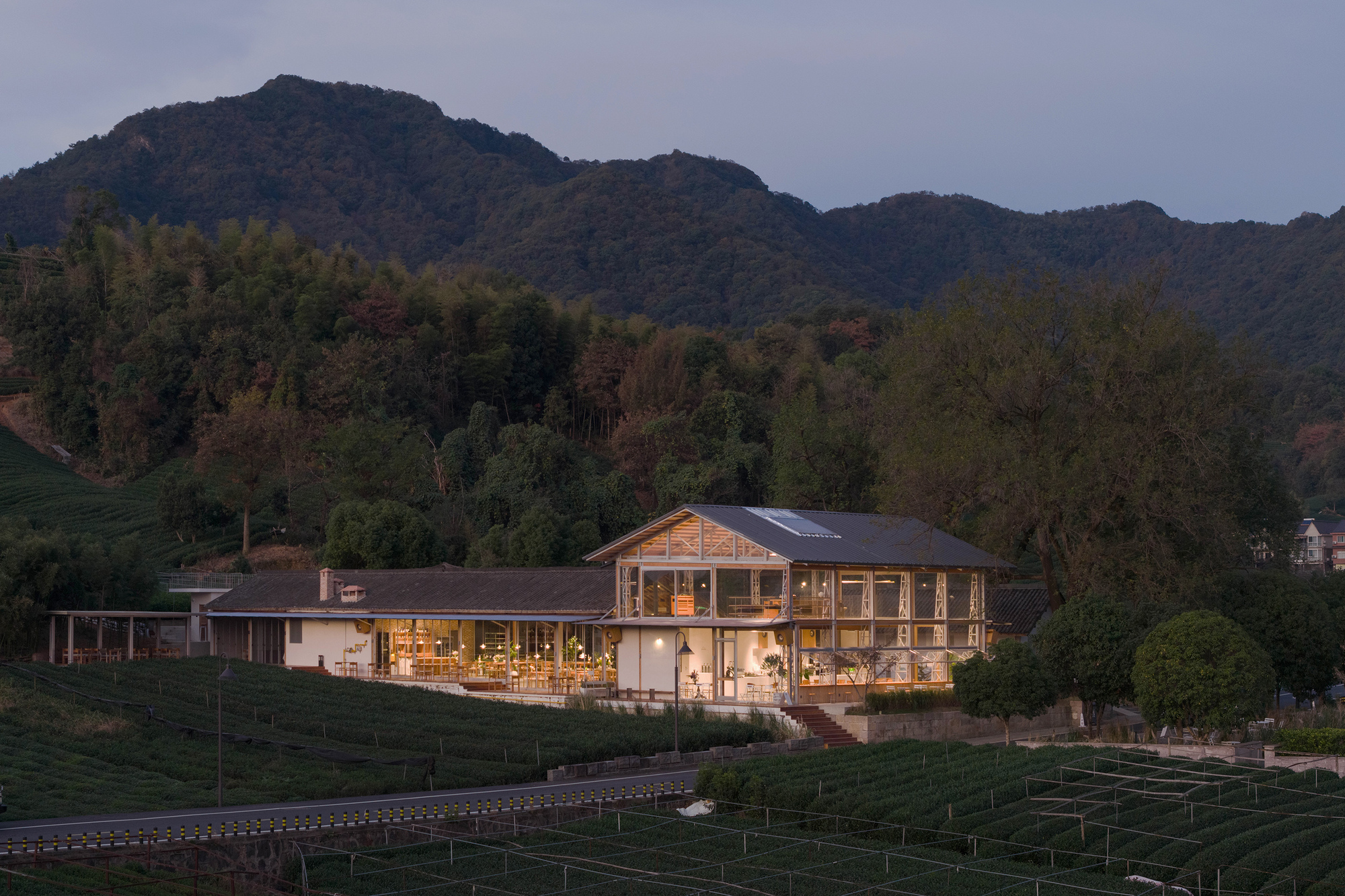 建築師試圖在蔥鬱綠意中,勾勒出一筆剛柔並濟的人造線條,讓商業行為與農耕地景並存不悖。這種類似於普利茲克建築獎得主王澍所提倡的「在場營造」理念,讓建築不再是外來物,而是從土地中生長出來的有機體,回應著杭州千年以來的茶文化底蘊。