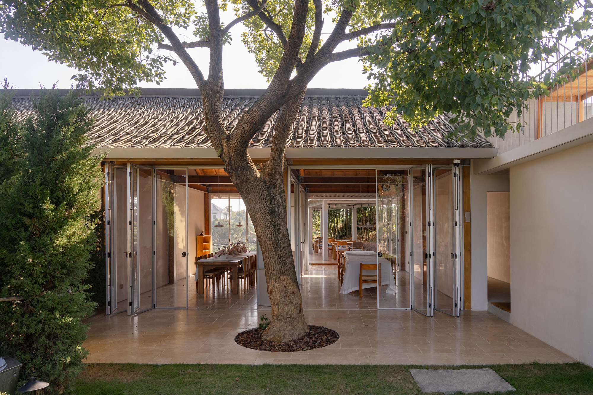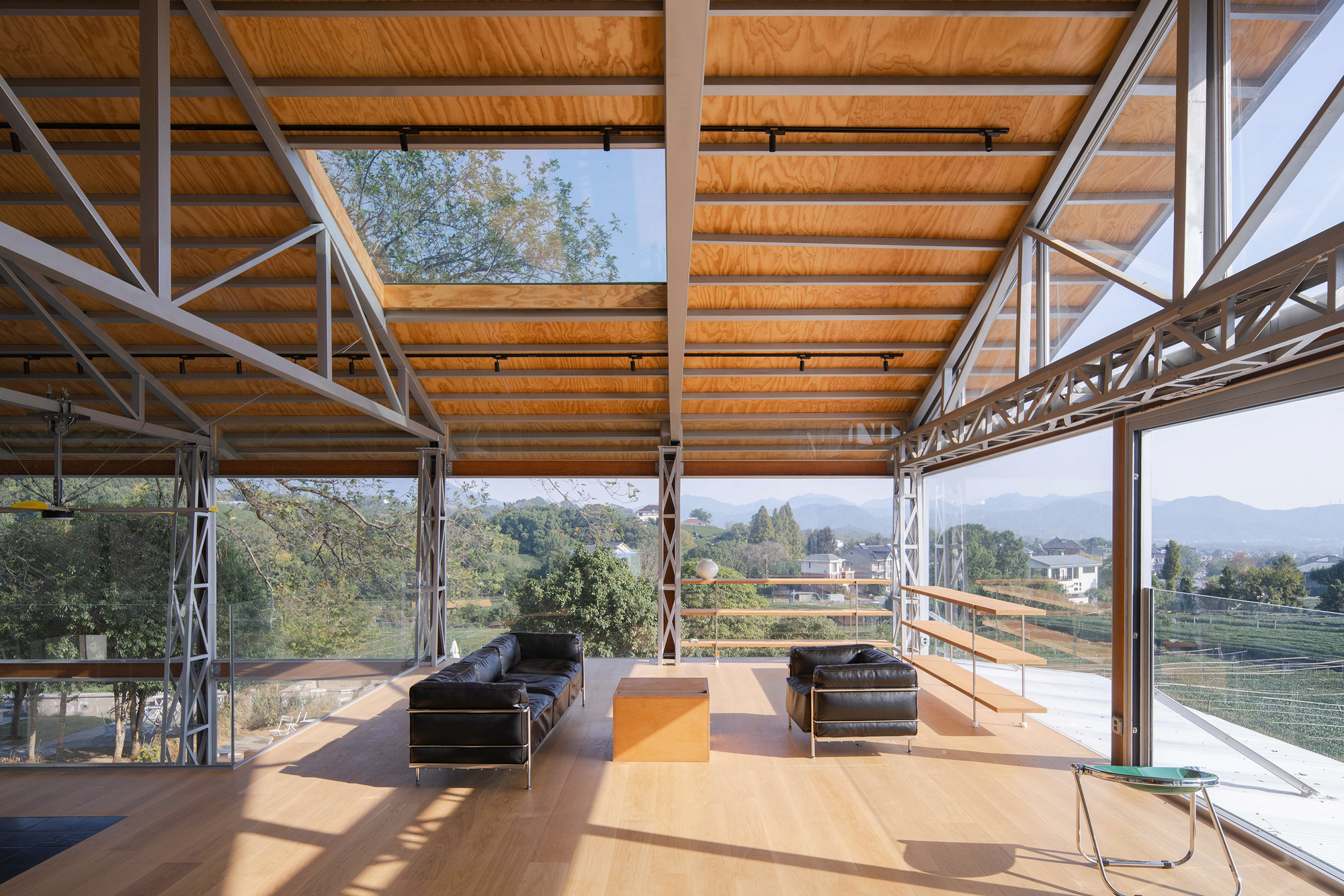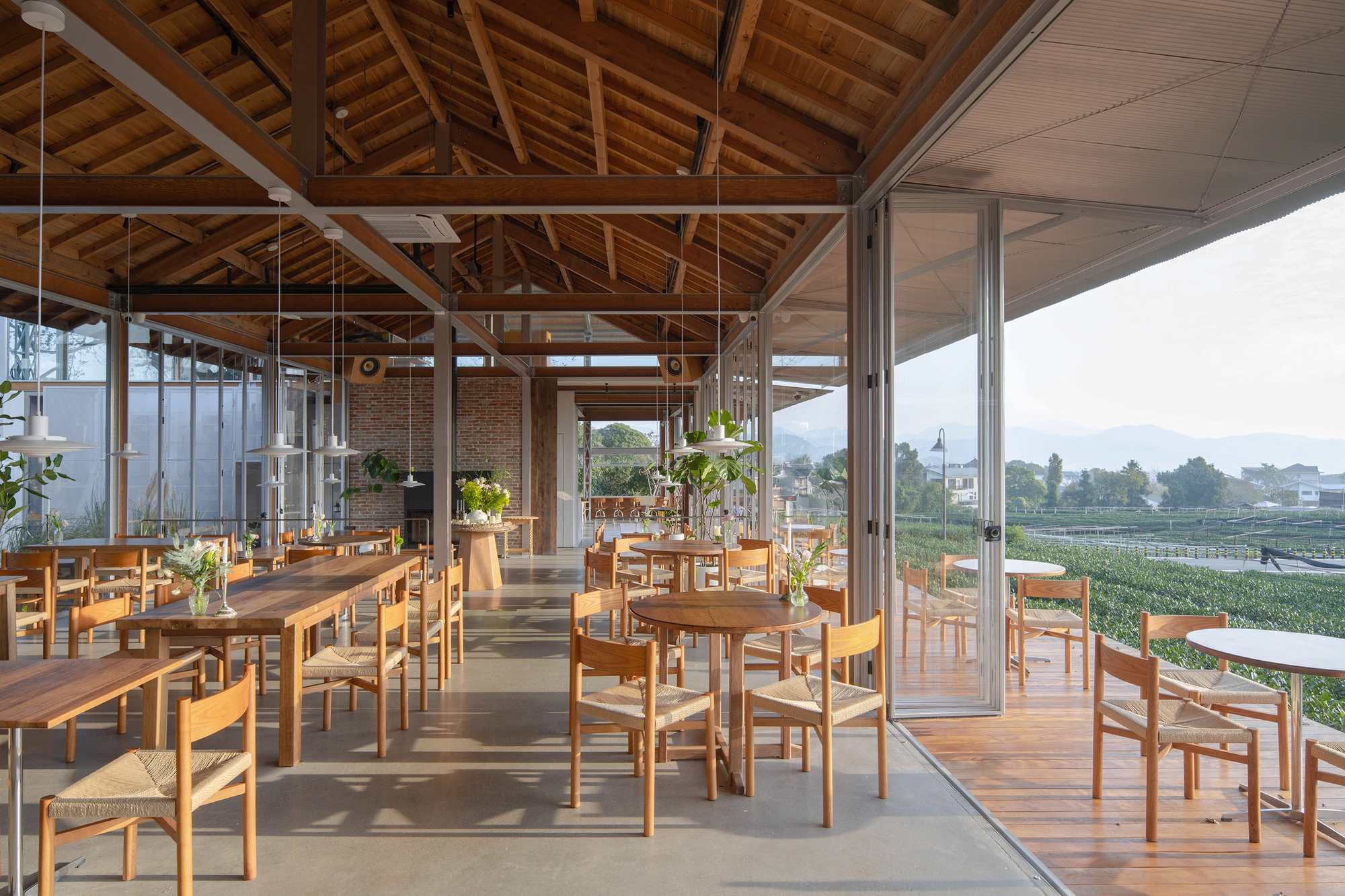 基地西側矗立的幾株高大喬木,不僅是歲月的見證,更成為建築天然的遮陽屏障,在炎炎夏日大幅降低室內能耗,實踐了被動式設計的智慧。正因有了這層綠色濾網,設計團隊得以大膽採用大面積落地玻璃與折疊門窗,將東北面地勢較低處的連綿茶園及遠處村落景致,毫無保留地引入室內。
