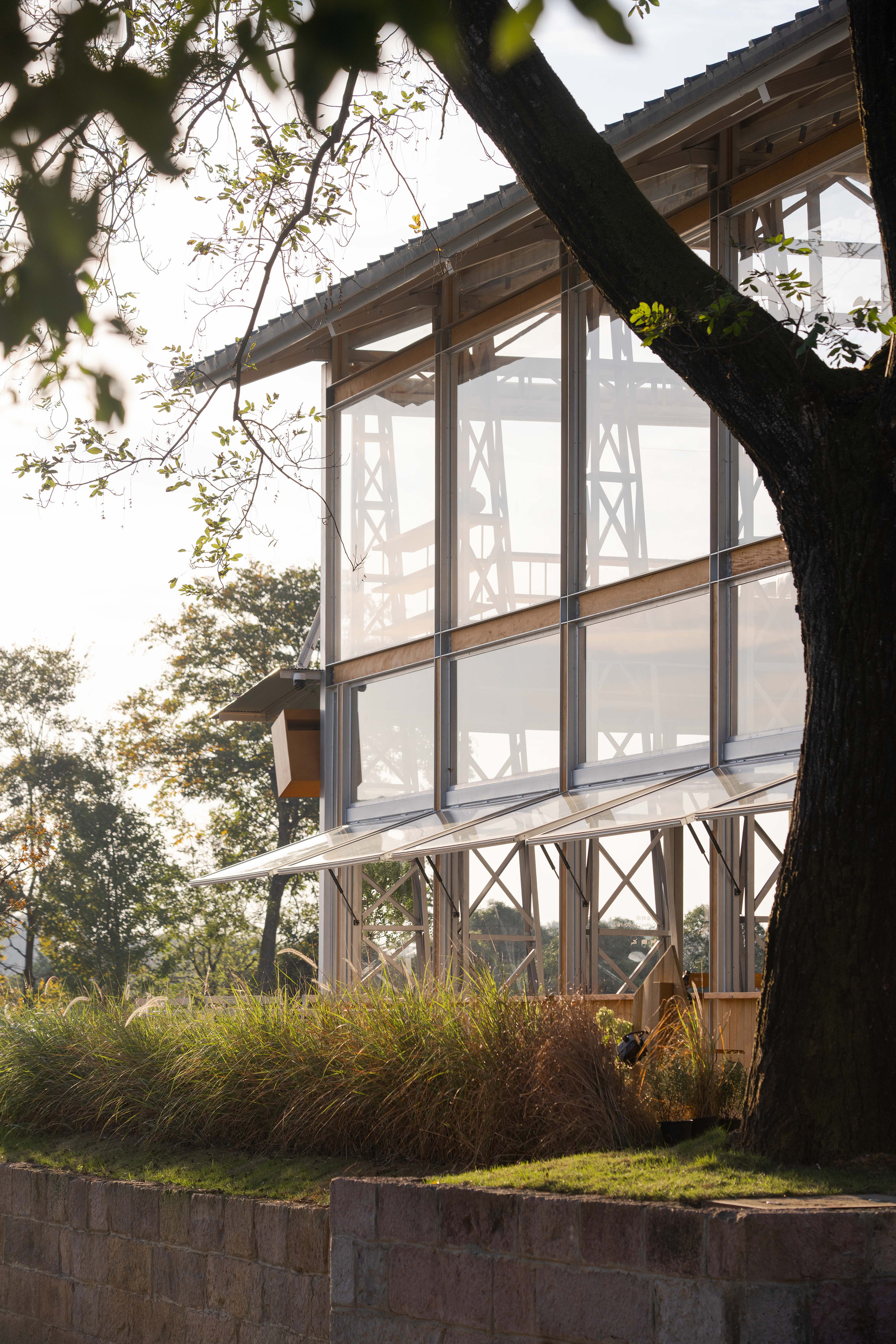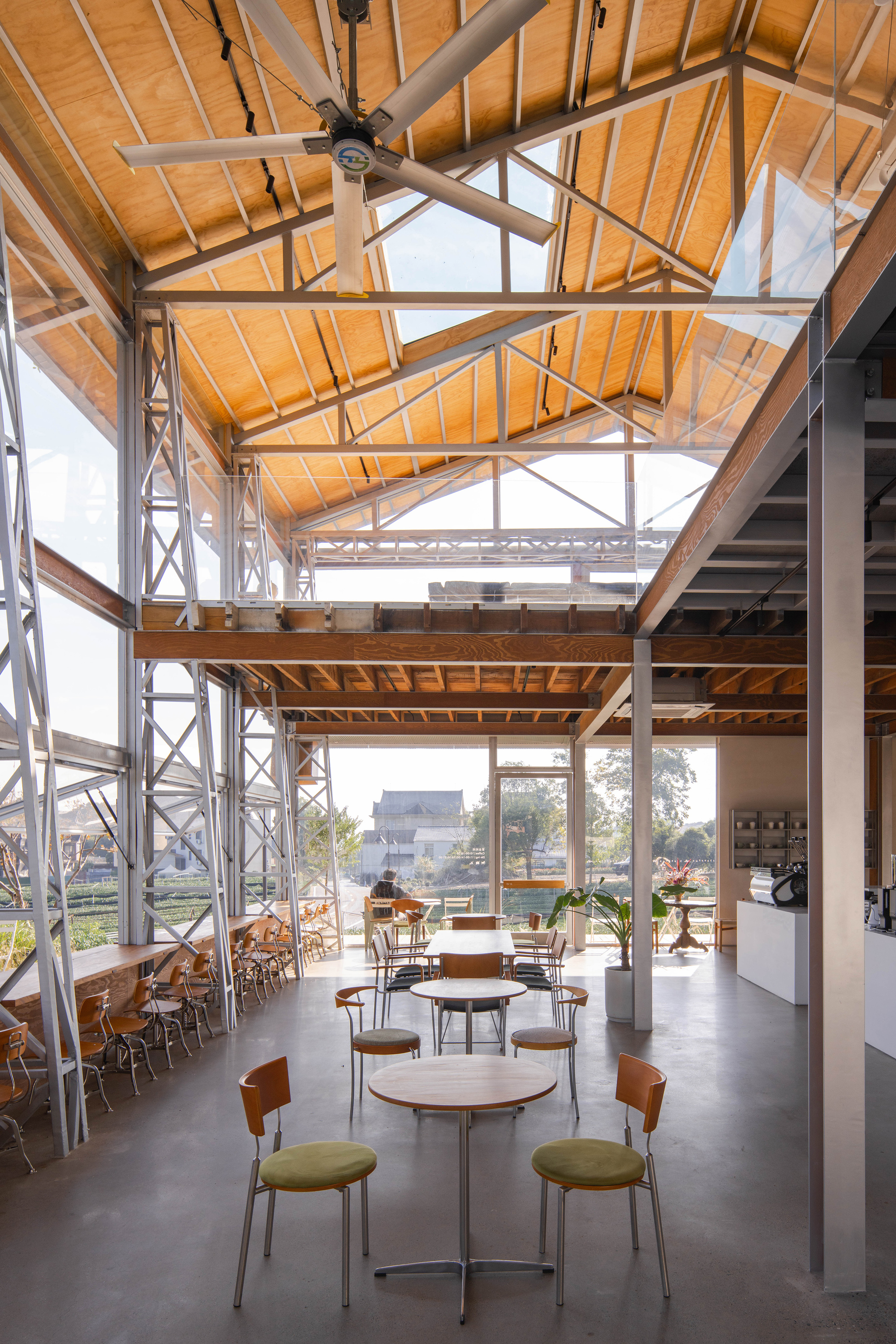杭州長埭村的茶園深處,壹山設計運用鋼構與玻璃通透特質,讓廢棄老屋在丁字型配置重生為引人入勝的咖啡廳