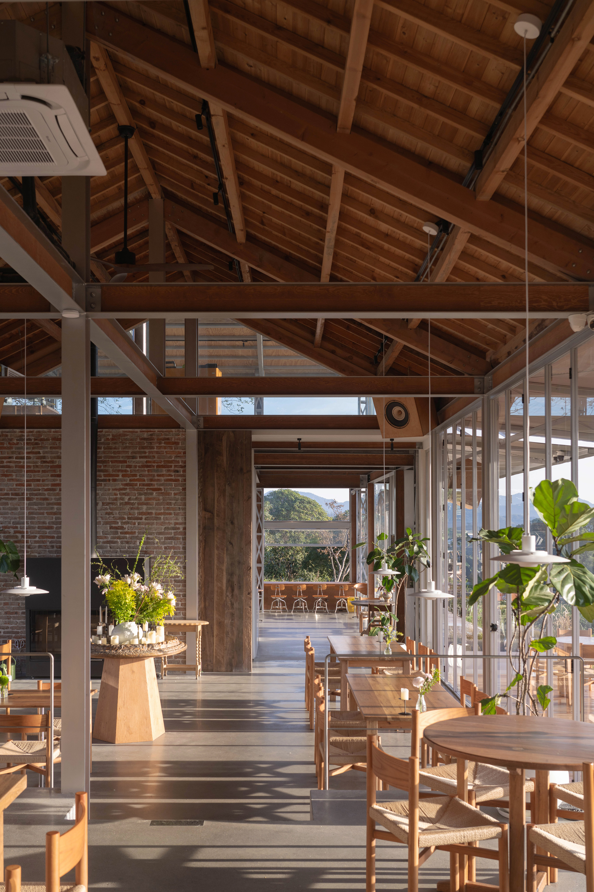 壹山設計運用東方建築奧妙的「灰空間」,特意在建築東面與北面構築了金屬懸挑屋簷,形成一道狹長的連廊。這處過渡場域,既非完全的室內,亦非純粹的戶外,卻有效地延伸了商業腹地,增加了餐廳的外擺餐位,大幅提升空間坪效與使用率。金屬材質的俐落線條與周遭粗獷的自然環境形成強烈對比,卻又在機能達成和諧。