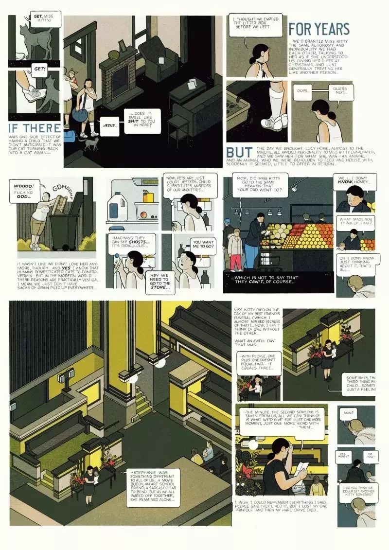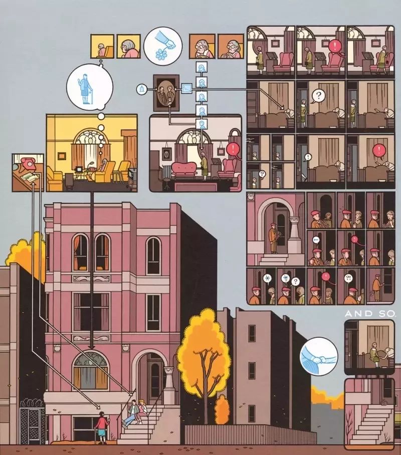 Chris Ware無疑是對建築的痴迷和熱愛的,建築是這部作品的載體,包括室內設計和色彩都非常考究,所以這部立體作品生動又獨特,二維的故事放在了多緯空間裡。