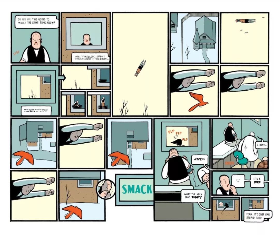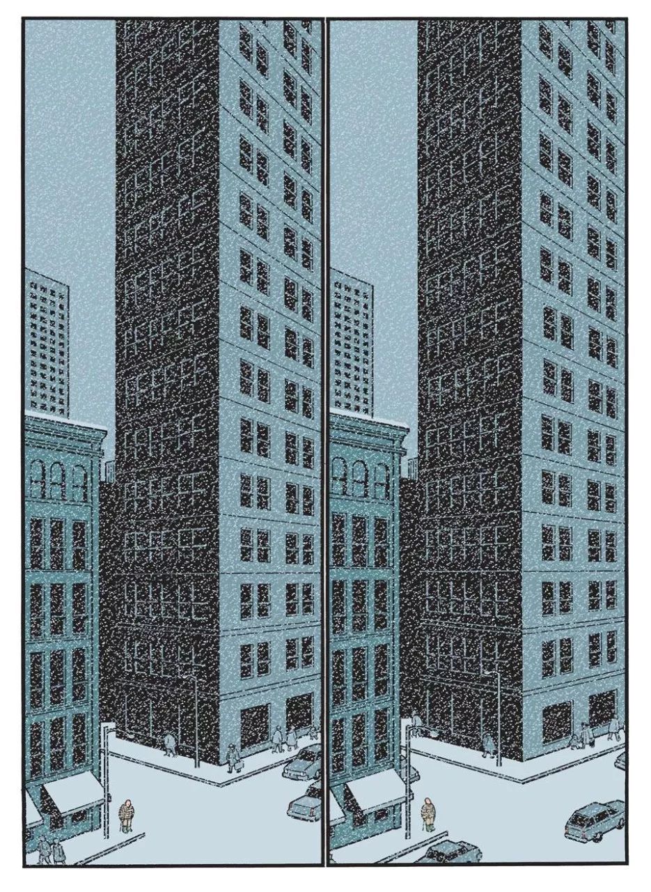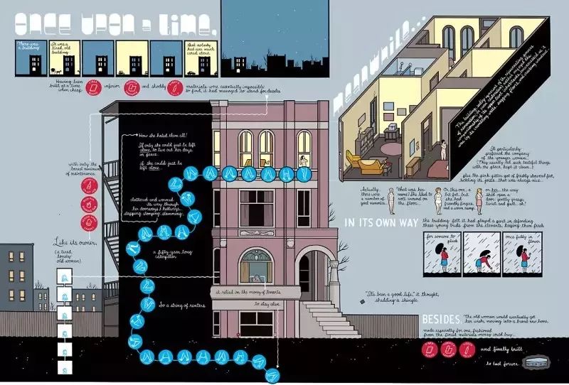 《Building Stories》是他成名作,他用了五年時間完整這部作品。一個老屋子的故事被拆解成14個非線性的圖形小說。在一個三層公寓樓裡,頂層住著殘疾的單身女性,二樓是爭吵的夫妻,一樓是房東老人,在Chris Ware的多維建築空間構圖裡,他們的故事獨立但是又相互交叉,沒有很強的戲劇衝突,用普通人的日常生活表達了人們內心的孤寂和精神的缺失。立體的建築結構裡空間場景的轉換,也推動了故事的進展。