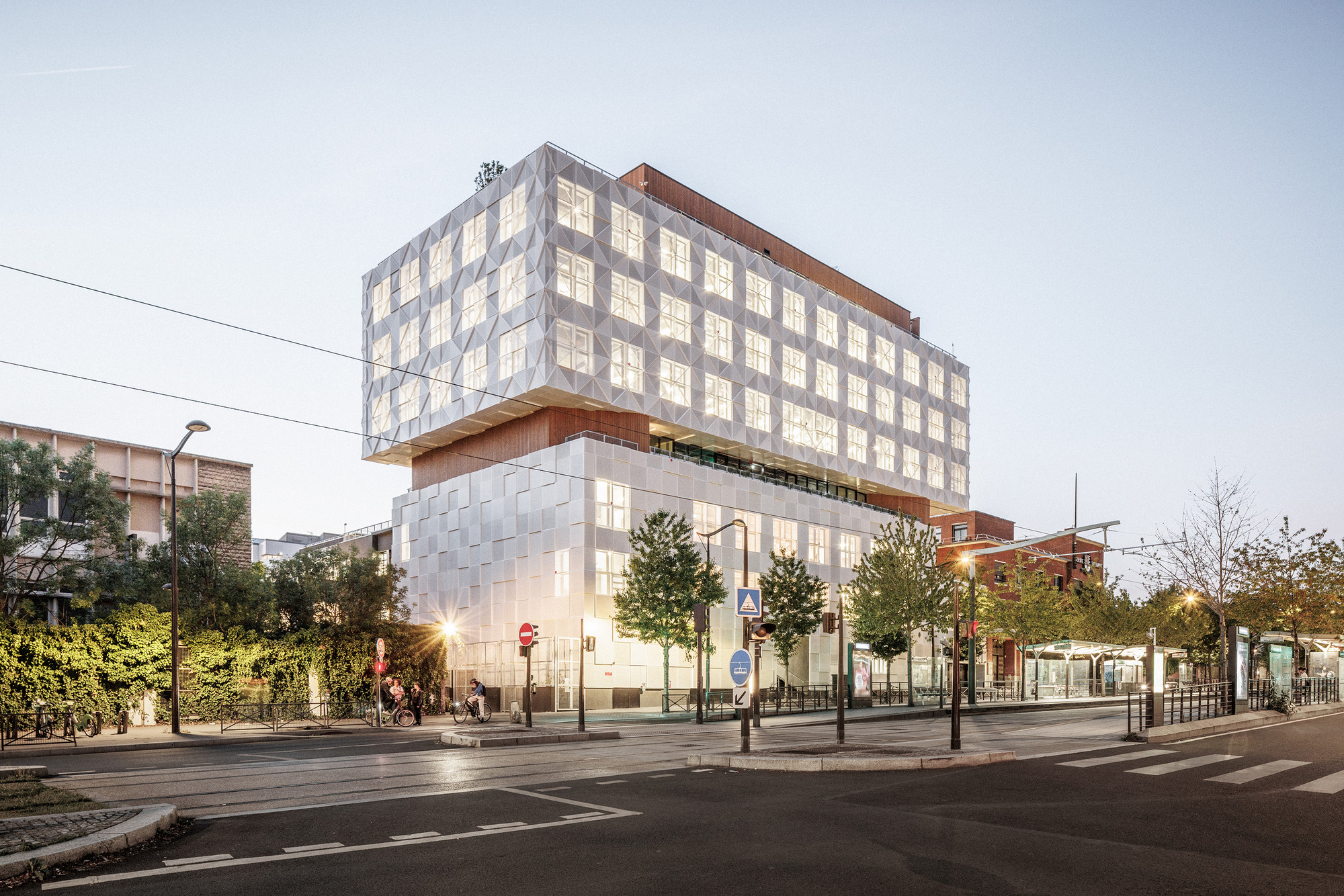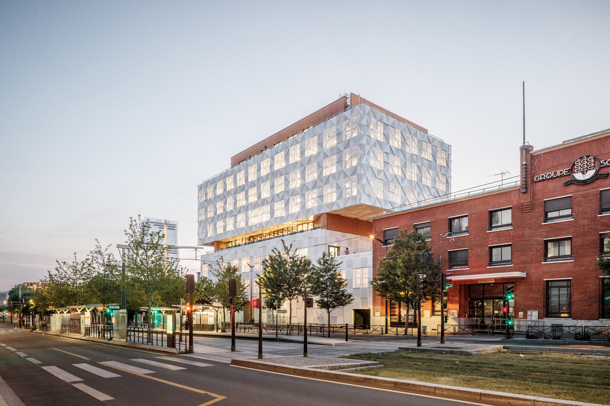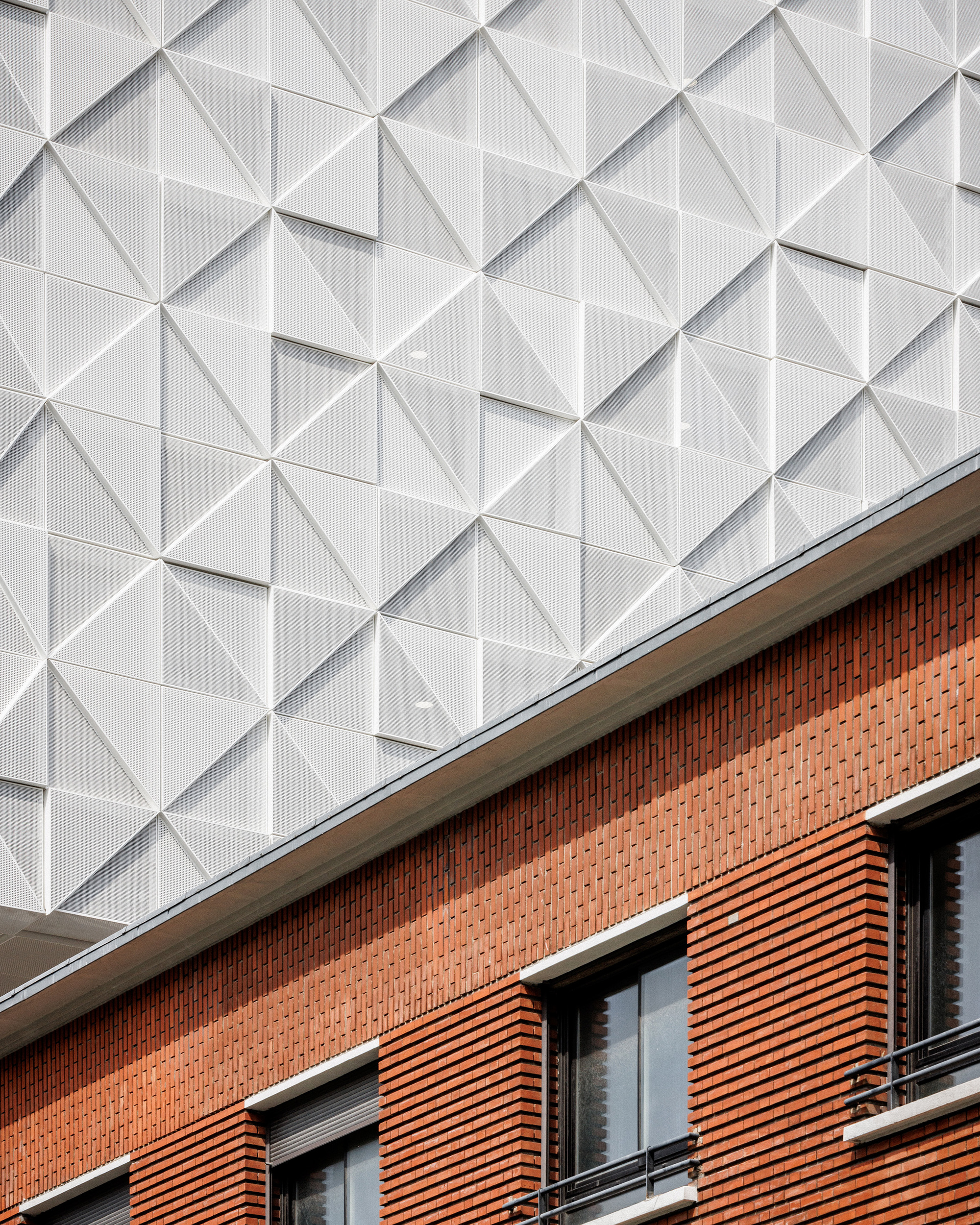 面對倍增的空間需求與有限的基地,建築師並未選擇拆除重建,而是採取「建築節制」的策略。他們保留了建於1962年的原有建築,並在其上疊加了四個基座量體與一個高达18米的五層金屬上層結構。這種做法不僅將總樓地板面積從3,600平方米擴充至9,025平方米,更展現了少即是多的設計哲學,同時尊重基地作為巴黎舊防禦工事(Bastion 42)的歷史紋理。