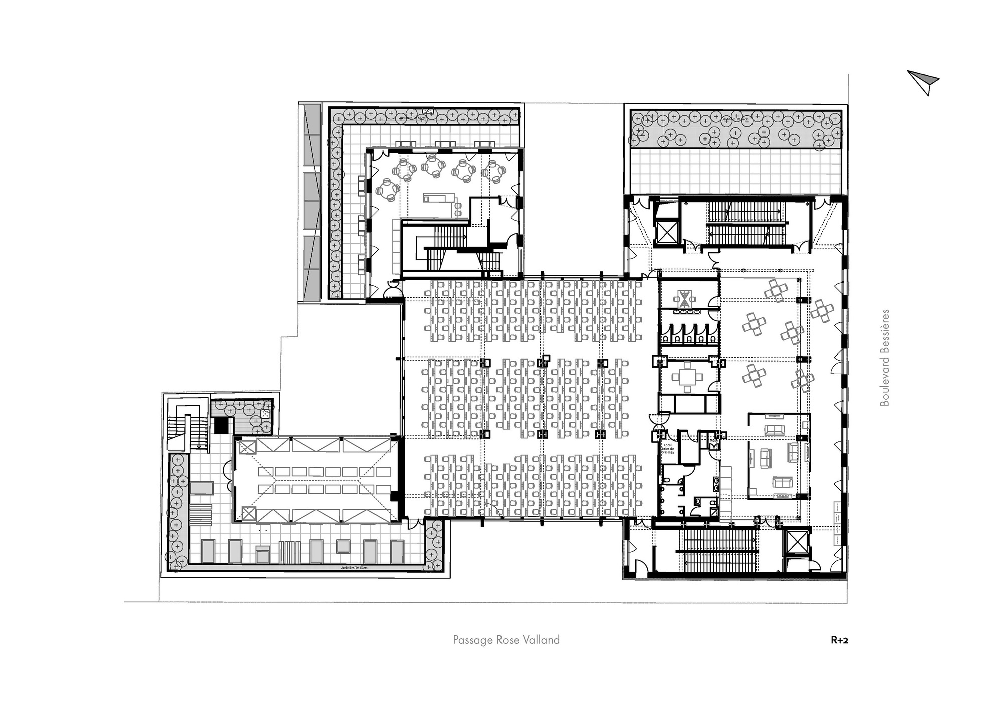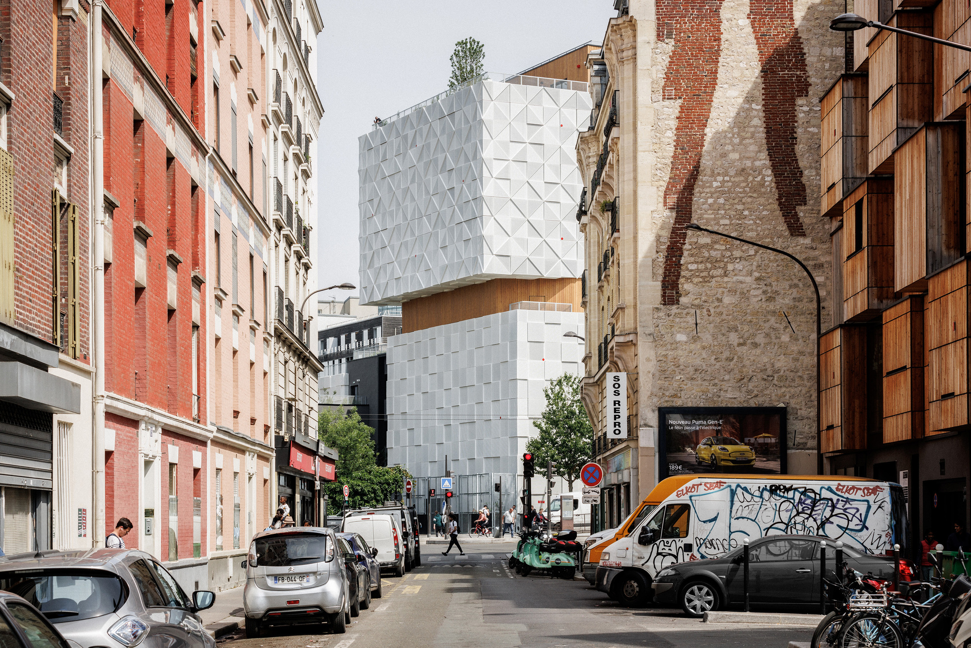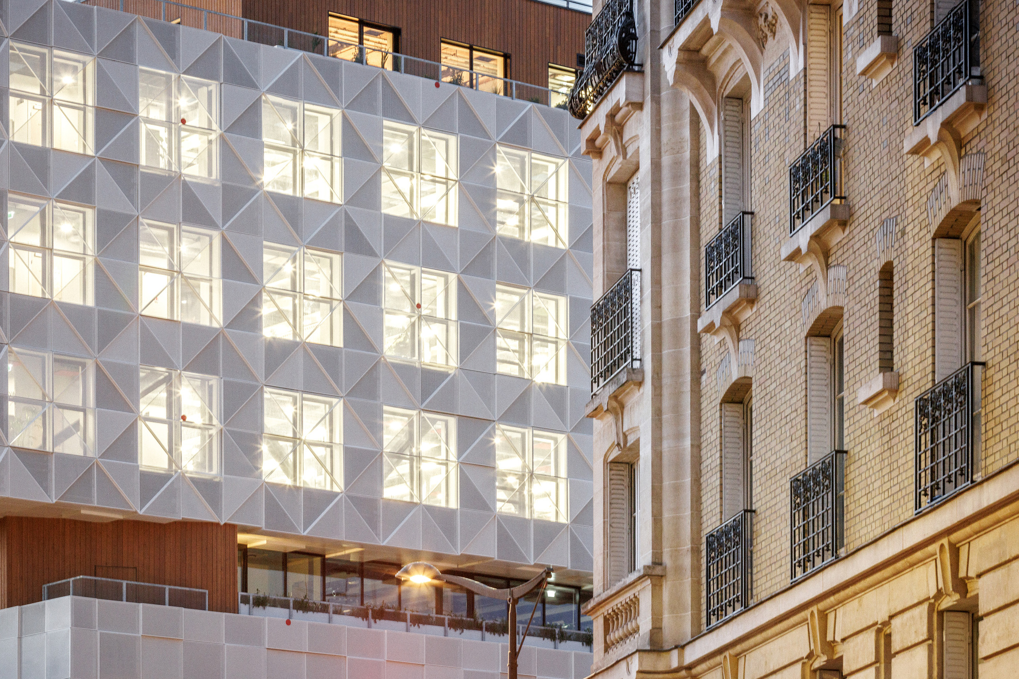 面對倍增的空間需求與有限的基地,建築師並未選擇拆除重建,而是採取「建築節制」的策略。他們保留了建於1962年的原有建築,並在其上疊加了四個基座量體與一個高达18米的五層金屬上層結構。這種做法不僅將總樓地板面積從3,600平方米擴充至9,025平方米,更展現了少即是多的設計哲學,同時尊重基地作為巴黎舊防禦工事(Bastion 42)的歷史紋理。
