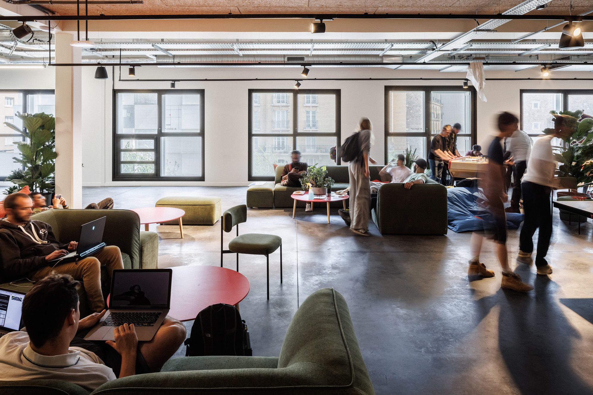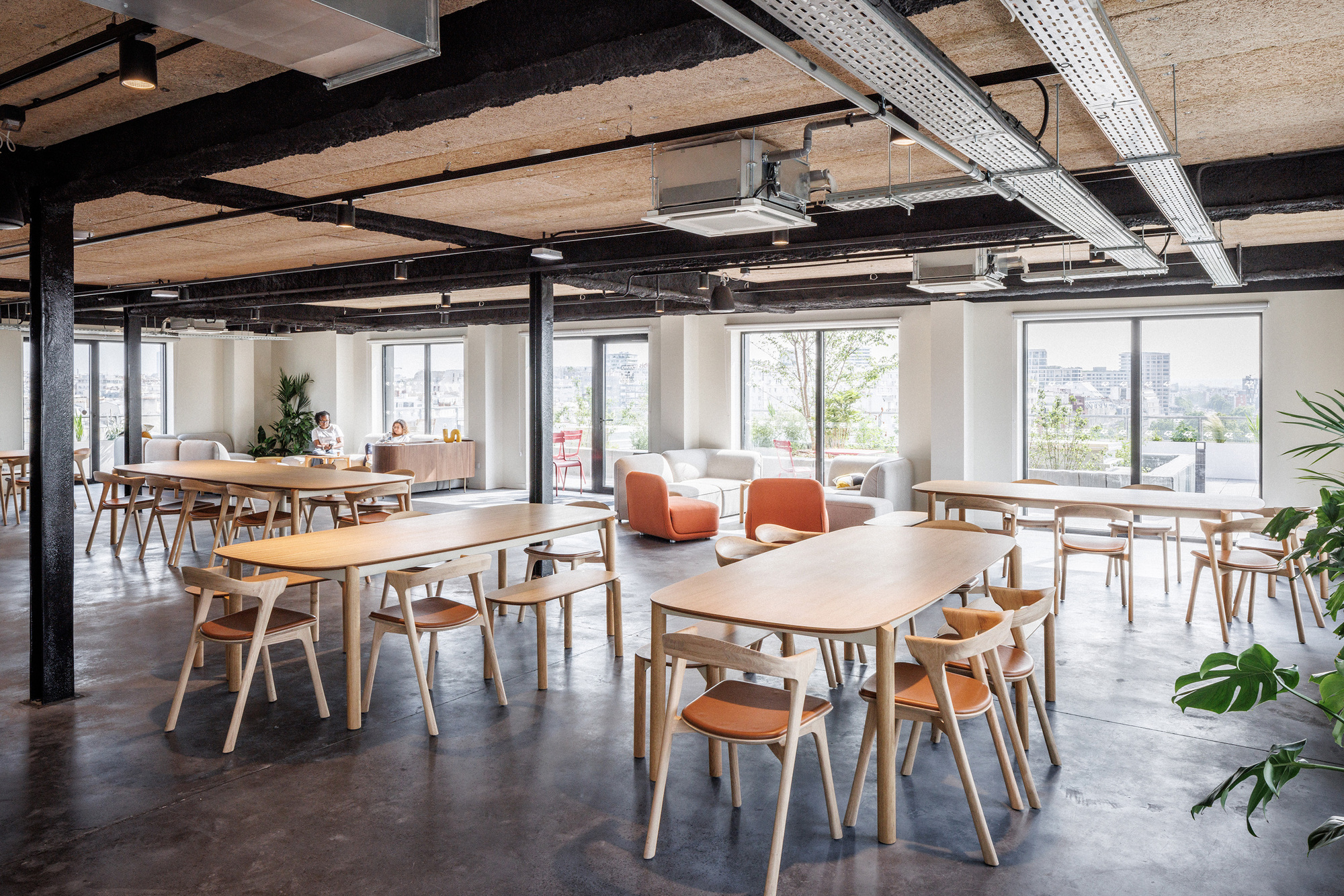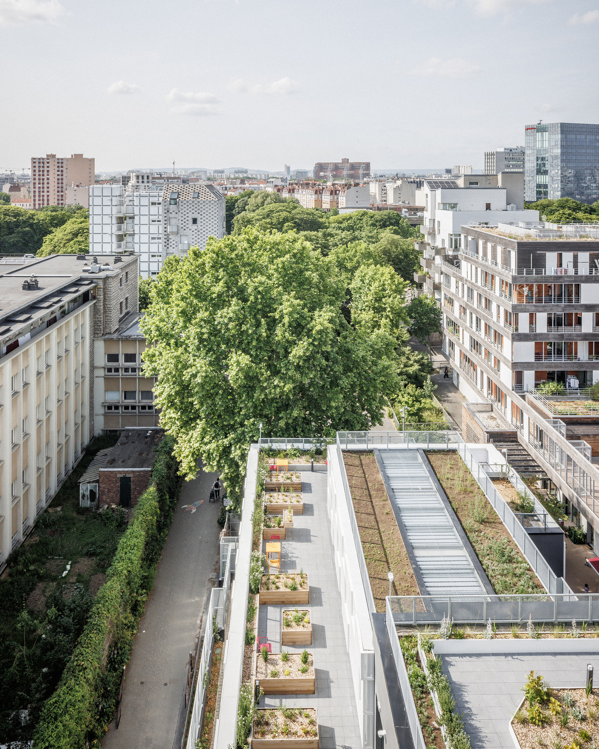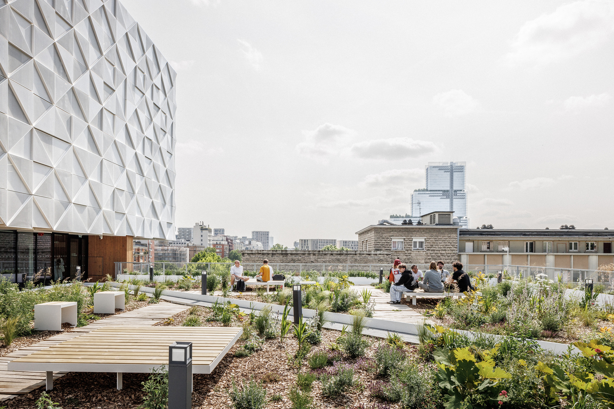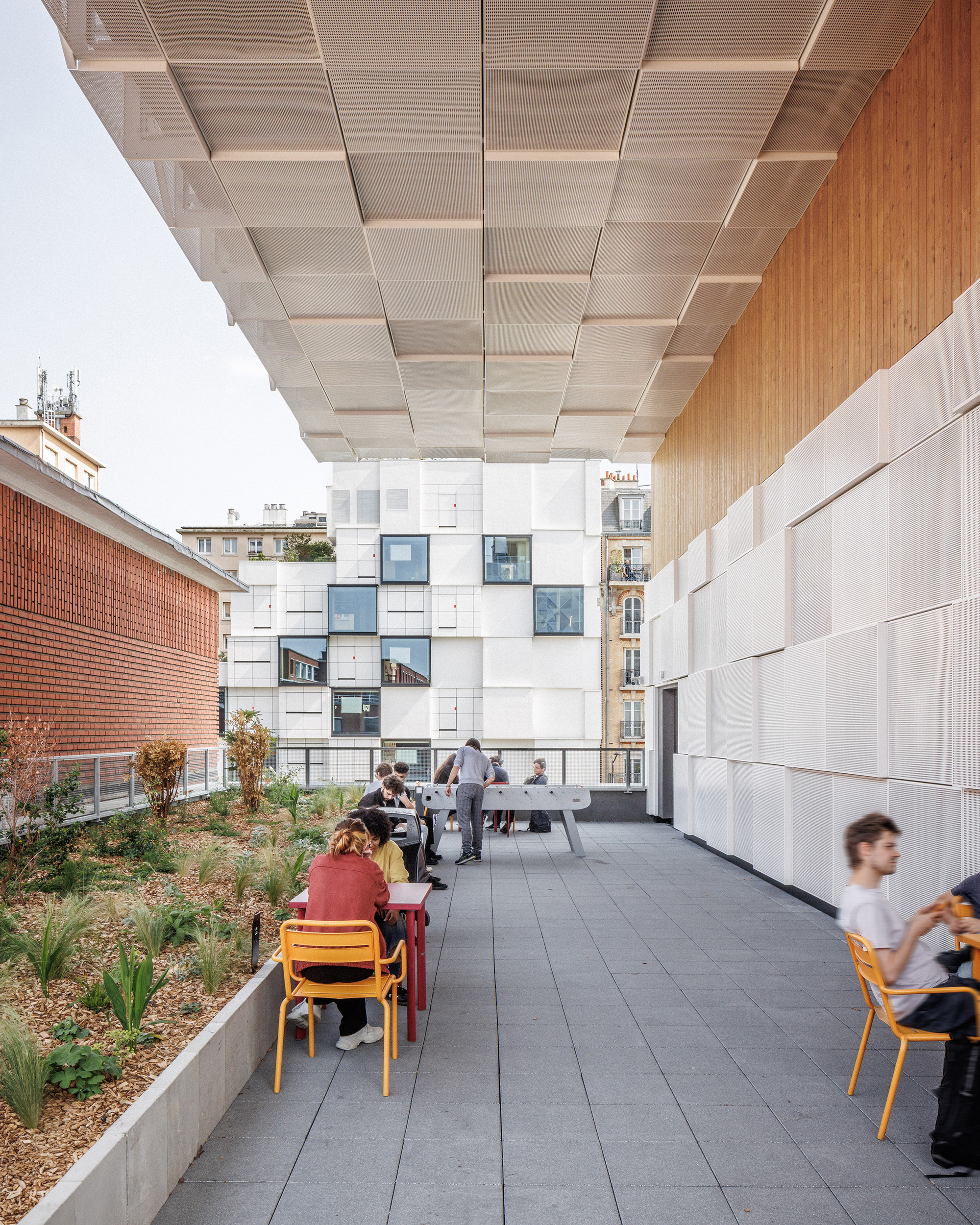 42UP並非孤立存在,而是與對街擁有700個床位的NOC42綜合體——「重塑巴黎」(Réinventer Paris)競圖的獲勝項目——形成了一種共生關係。這兩個項目自2015年起便被構想為一個統一的願景,共同組成了一個融入鄰里的真正城市校園。這個相互連結的生態系統代表了一種新型態的城市教育基礎設施,在這裡,生活、學習與休閒空間在城市紋理中無縫交織,打破了傳統校園與社區的界線,為學生提供了全方位的支持環境。