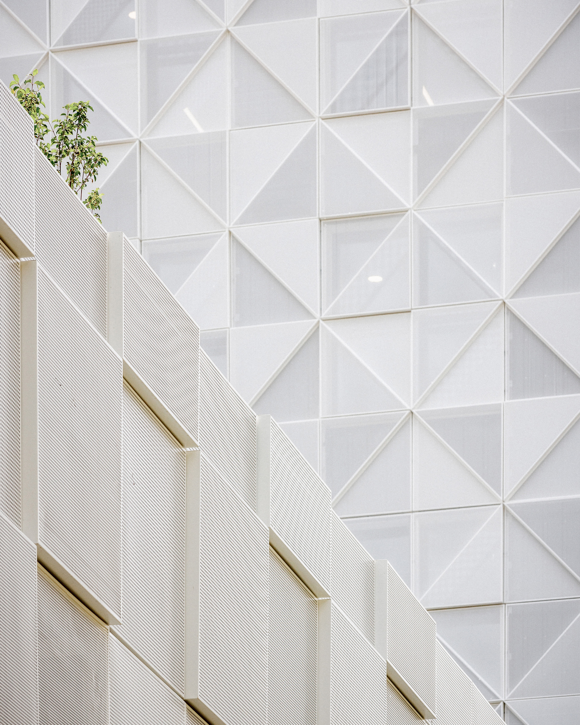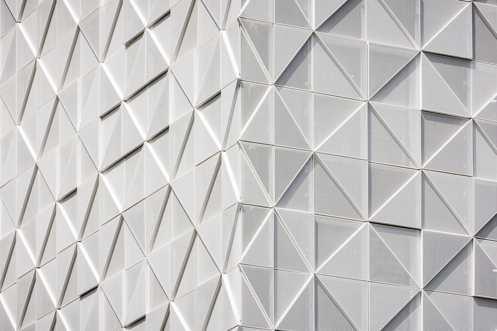 立面設計採用1.17公尺乘1.17公尺的網格,在上層結構轉化為三角形模組,隨著日照角度的變化產生動態的光影浮雕。這層「金屬蕾絲」不僅是視覺裝飾,更具備重要的機能性。對於容納了1,400台高發熱電腦的建築而言,這層微孔外殼提供了必要的遮陽保護,同時將自然光引入室內。立面的透明度隨天氣與時間而變,創造了室內外之間不斷變化的對話,並顯著提升了夏季的室內舒適度。