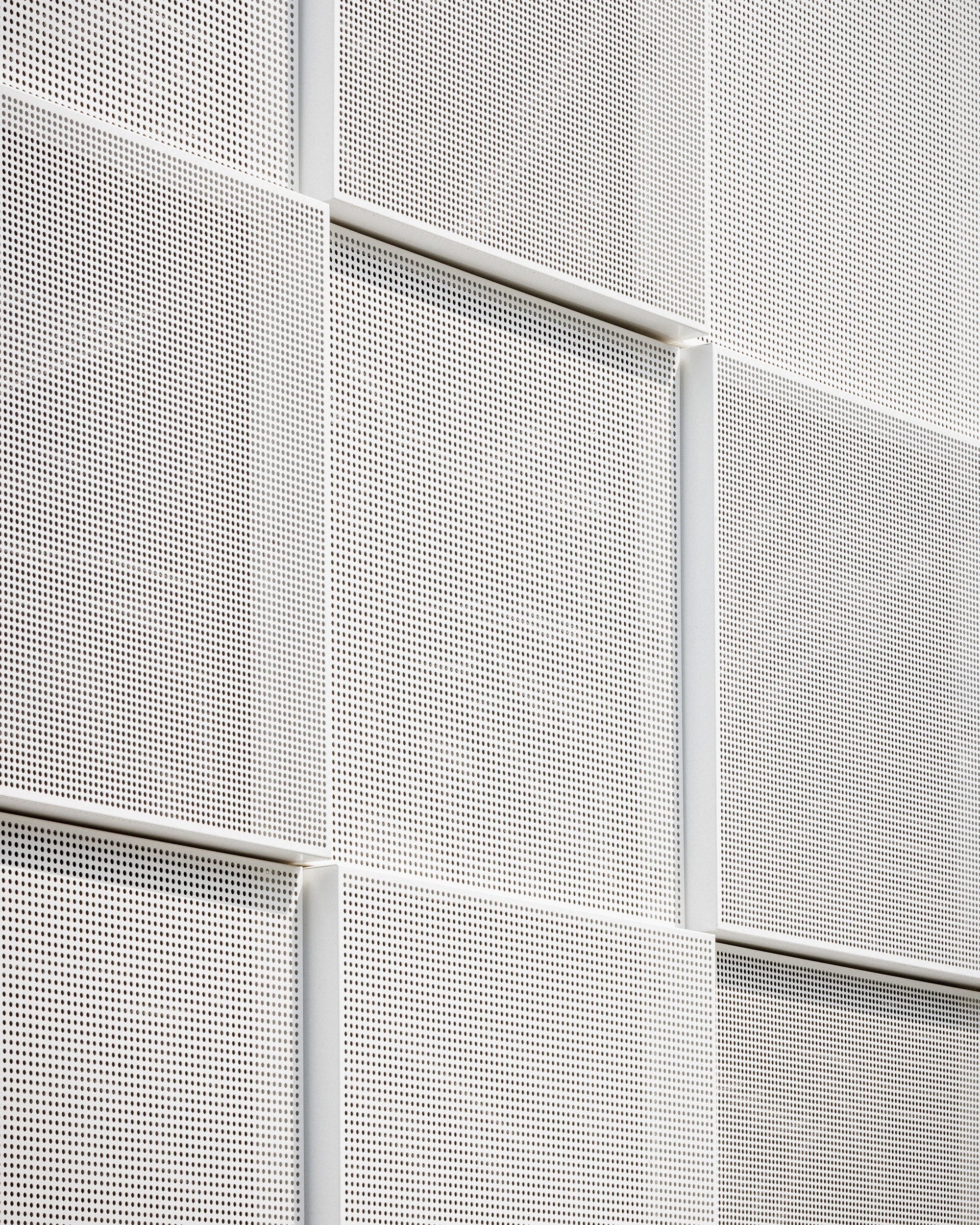 新舊建築透過一層白色的沖孔金屬表皮統整,這層表皮與原有建築的黑色立面形成鮮明對比,同時與鄰近的NOC42宿舍在視覺上產生和諧共鳴。