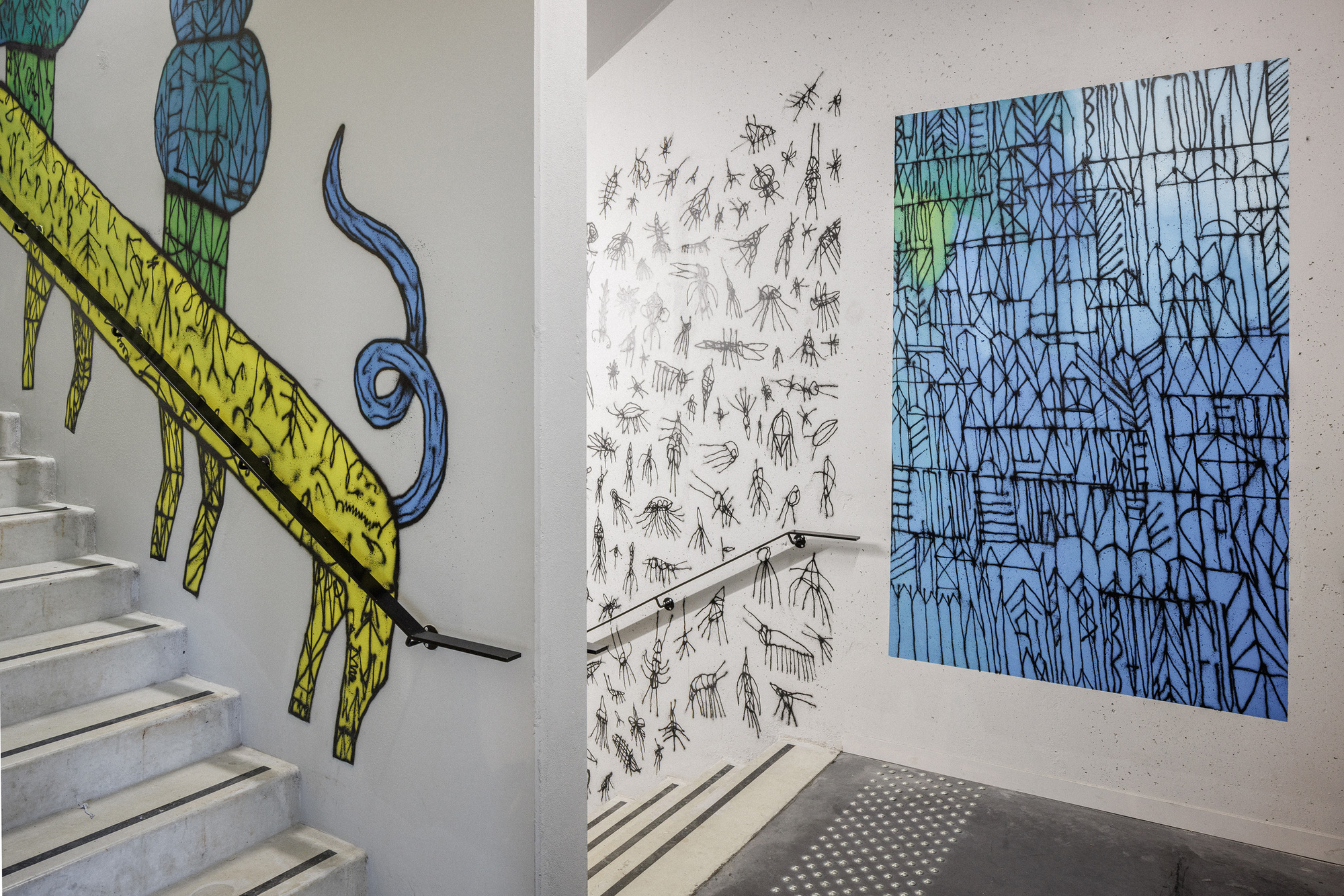 室內採用木絲吸音板與紡織覆蓋物來解決聲學問題,並透過紅、綠、藍三種鮮明的色彩識別系統,讓使用者在不同樓層間能直覺導航。此外,策展人Nicolas Laugero Lasserre策劃的街頭藝術(Street Art)為四座主要樓梯注入了生命力,將垂直動線轉化為藝術之旅。每個樓梯間展現不同的藝術宇宙,不僅創造了獨特的空間識別,更豐富了學生的日常體驗,將單調的移動過程轉化為發現與靈感的時刻。