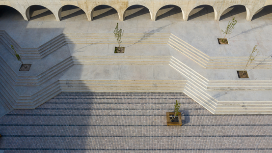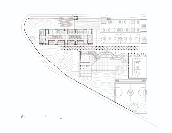 建築師在該中心設置了多個不同的運動和娛樂區域,包括籃球場、足球場、廣場、公園、花園、以及順應自然地形所打造的台階和平台。