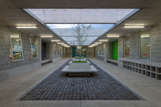 清水混凝土打造的活動中心分為三棟建築。1號樓主要用於教育所需,以提供音樂、藝術和電腦等教學所需的空間,同時還包含了廚房、圖書館和多機能室。建築師將這棟教學樓設計為單層,並於內部設置了兩個相連的庭院。這種庭院式天井的設置,使得大樓無需窗戶,就可以實現通風和照明的基本需求。而無窗戶的立面設計,也在一定程度上對孩童進行了人身安全上的保護,也使得教室內的教學設備免於被盜。此外,這樣的設計,還可以進一步提高孩童的課堂注意力,使得他們不被外面娛樂區域的活動所分心。