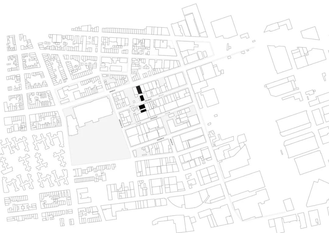 與其獨立於所處的都市語境,項目散佈式的建築體塊在城市肌理間相互交織。帶有數個入口的室外口袋空間提供了無數與周圍社區交流聯絡的機會,但同時也提供了遠離密集型城市的避難所。於大型城市街區內穿行而過的公共路徑,營造了全新的通勤和探索方式。庭院和要道穿梭於現有建築之間,將來訪者從四週的更私密的空間帶入到位於中心的畫廊和展覽館區域。