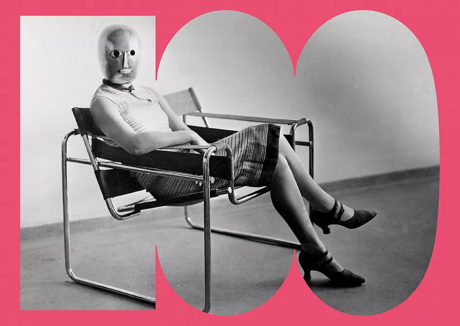 一位頭戴奧斯卡‧施萊默(Oskar Schlemmer)包浩斯舞劇面具的女子坐在由馬歇‧布勞耶(Marcel Breuer)設計的瓦西里椅(Wassily Chair)上,這是世界上第一把鋼管皮革椅,1926年,圖片來源:bauhaus100