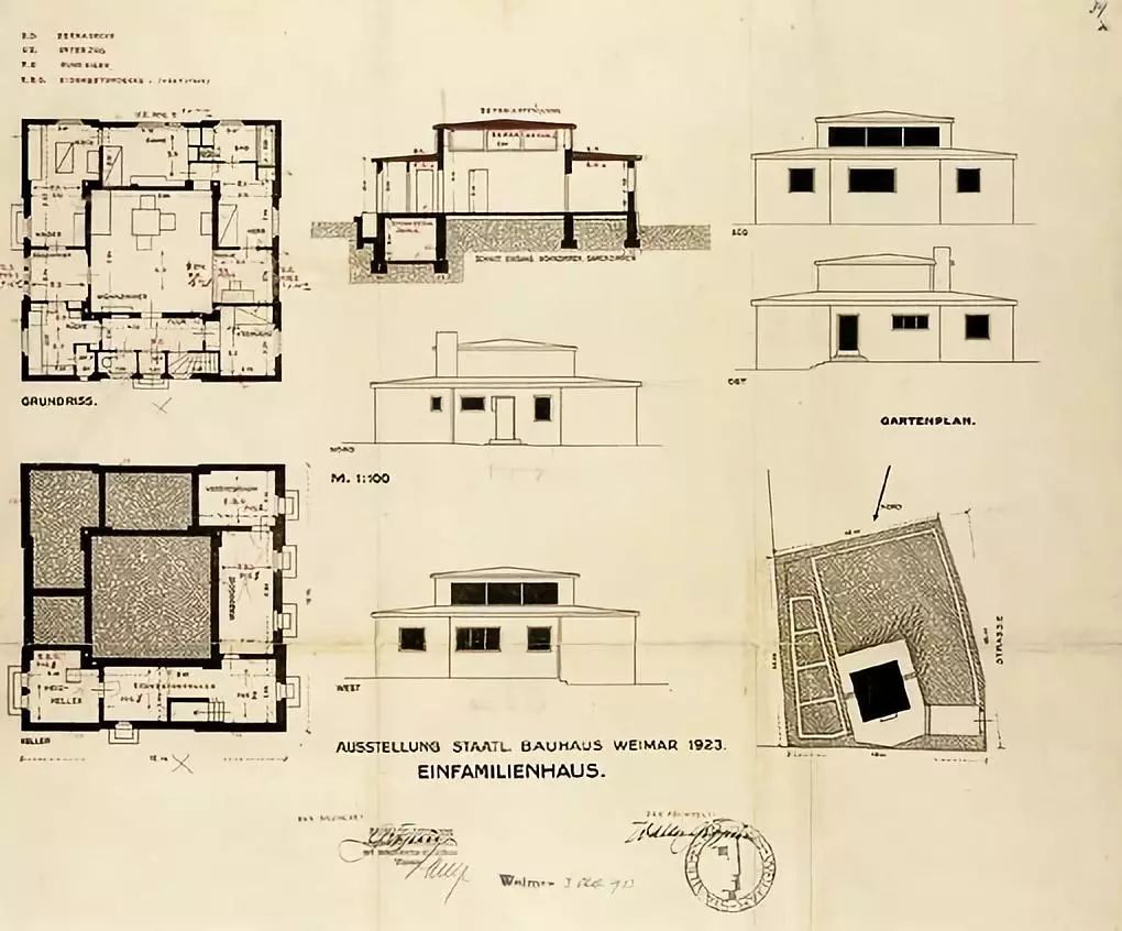 從地理層面而言,第一階段是由沃爾特‧格羅皮烏斯(Walter Gropius)在一戰廢墟上於1919年創立的包浩斯,該學校由魏瑪公立的應用和美術學校合併而成,他招募了眾多大師級教師並呼籲共同創造「未來的建築」,Tom Wolfe在《從包浩斯到現在》中將其比作「一個可與伊壁鳩魯花園相媲美的哲學中心」,但隨著第三帝國的崛起,在右翼圖林根政府的排擠下,不得不於1925年3月31日被迫關閉;第二天在薩克森州的德紹(Dessau)重新開放的第二所包浩斯則前後存在了7年,直到1932年10月佔據德紹的納粹市議會勒令將其關閉;